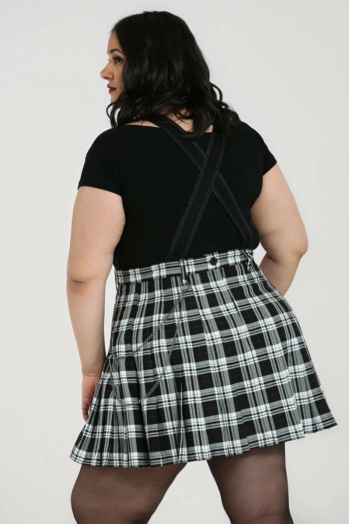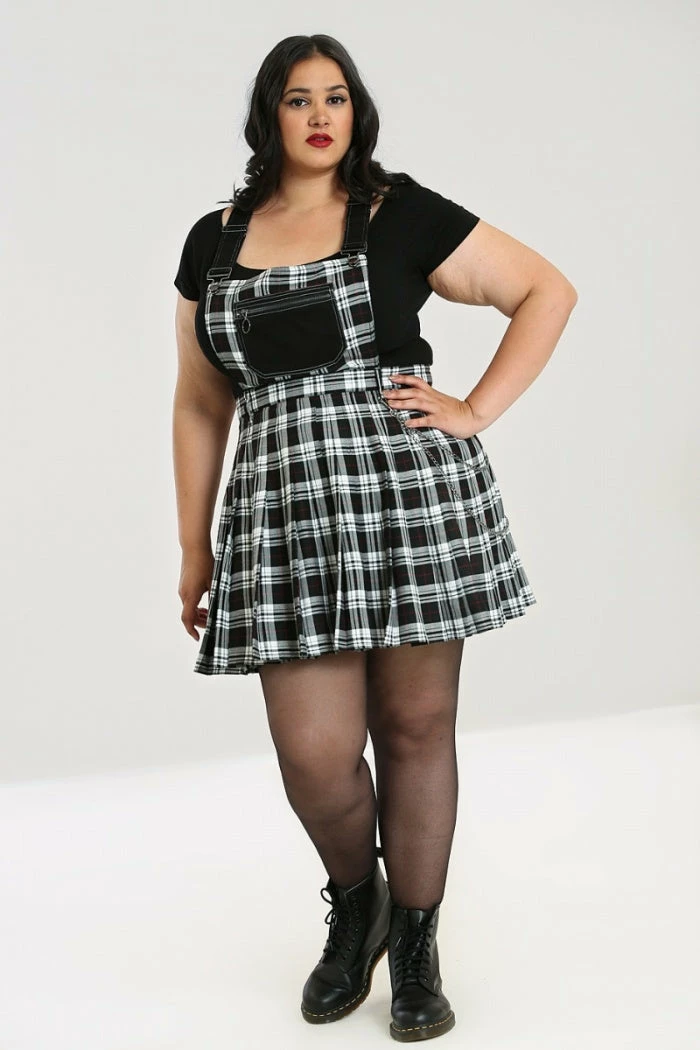 Gorgeous black and white tartan mini dress in a pinafore style from Hell Bunny. This stunning monochrome dress features a fitted waist with belt loops and a pleated skirt. Due to the pinafore style, the dress is shown worn over a black t-shirt (not included) in the images and also looks awesome worn over a long sleeve top. It fastens with a back zip and button and also features a large black chest pocket with zip.