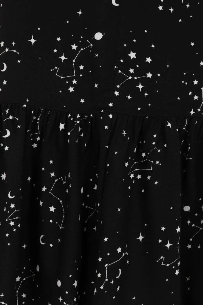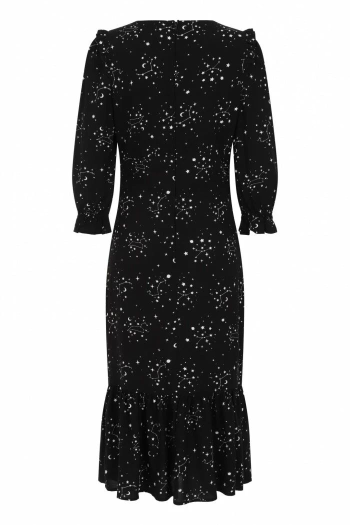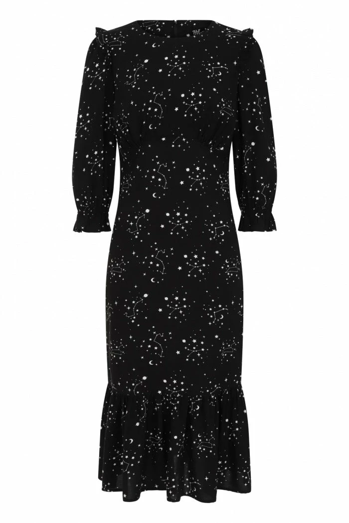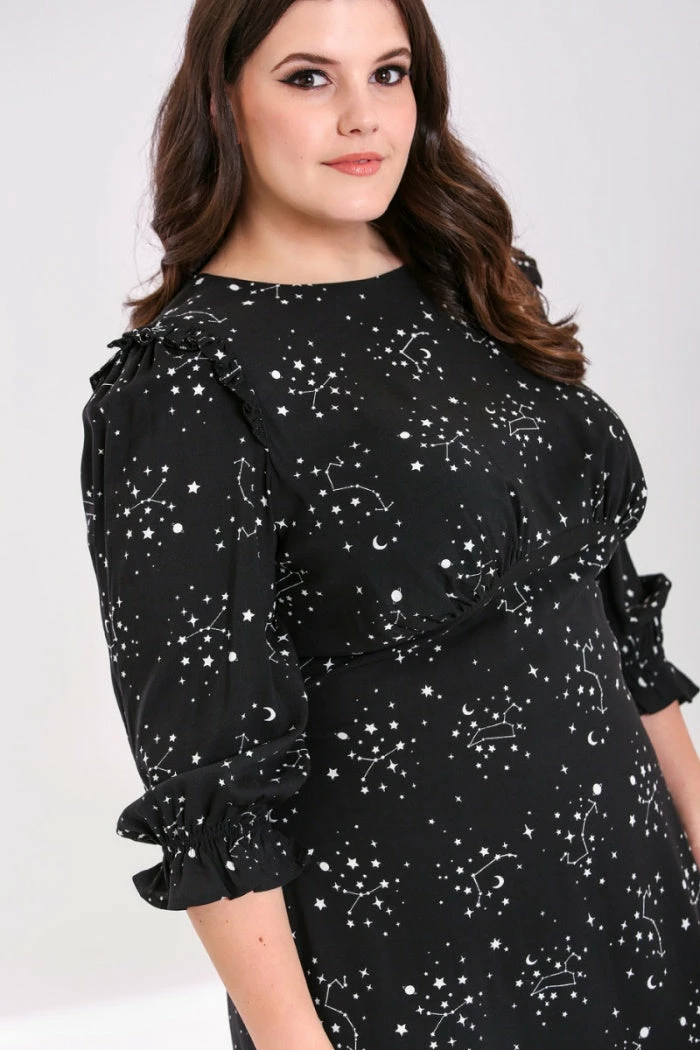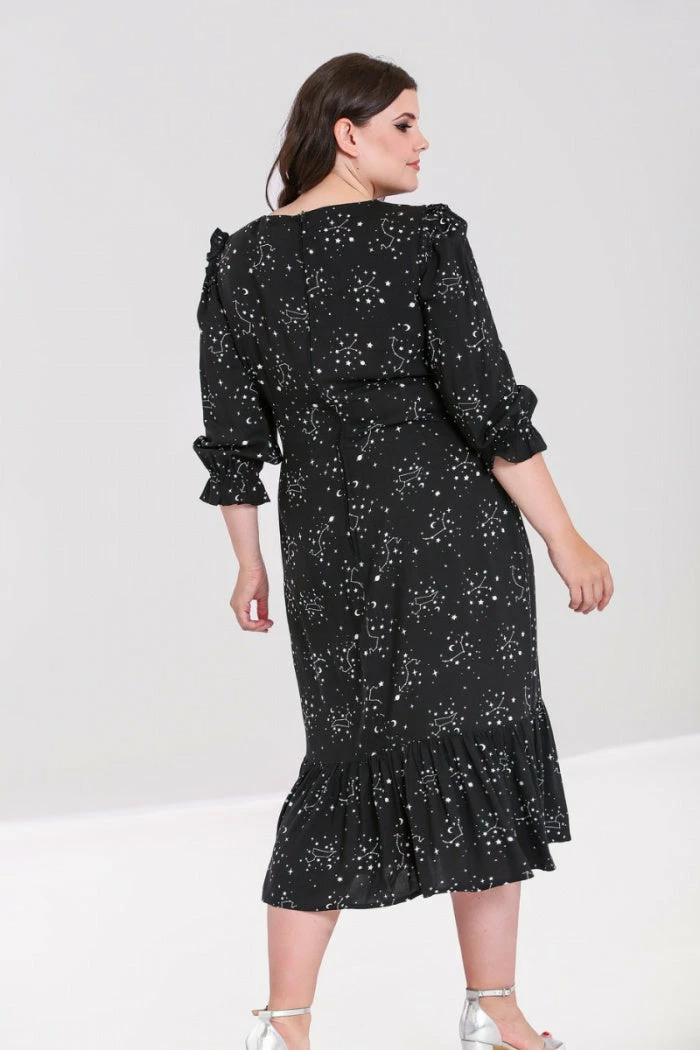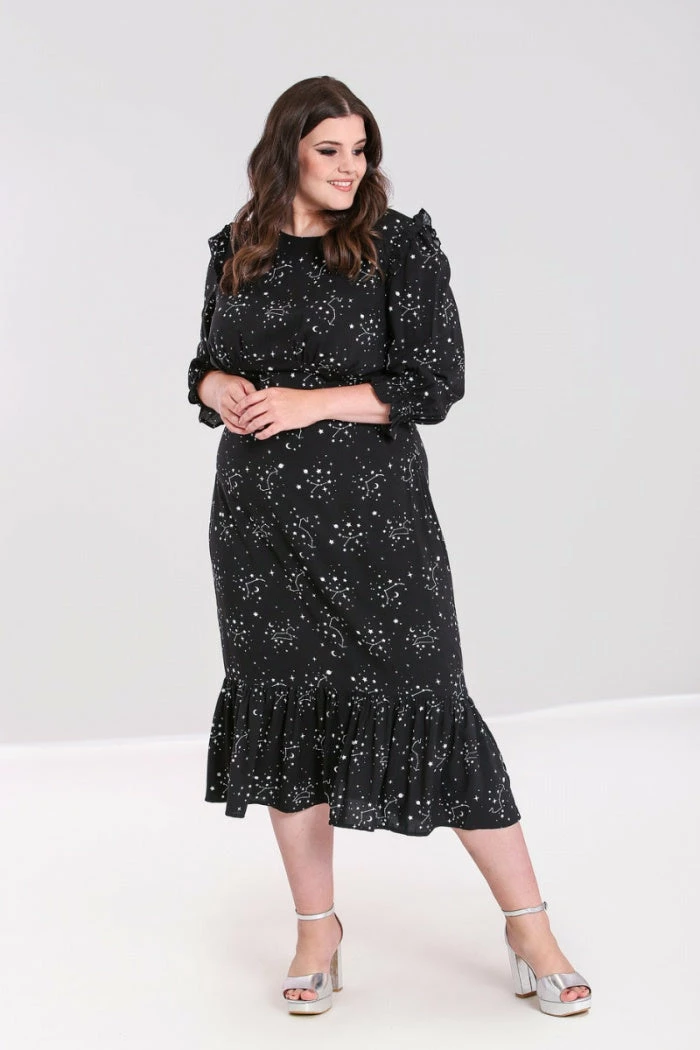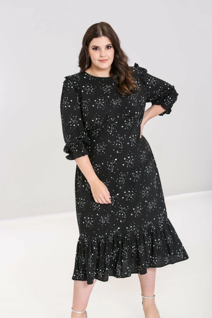 Must-have black maxi dress with white contrast celestial star print from Hell Bunny. This awesome monochrome 3/4 length sleeve dress features frills on the sleeves, high neckline and the bottom panel and fastens with a back zip. This lovely dress is fitted at the waist and then flares out. It looks great dressed up or down!