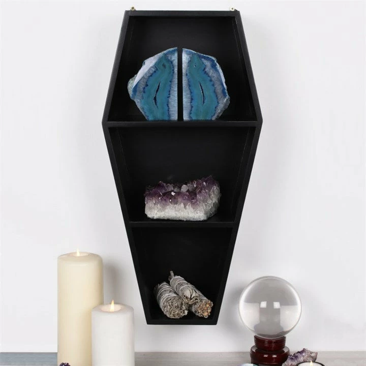 An awesome, well made, coffin shelf to beautifully display your favourite potions and witchy trinkets. A fabulous size standing at 49.5cm, with 24.5cm at the widest point and 11.5cm deep, in black with a soft subtle sheen. Free standing or comes ready with super helpful wall triangle ‘D; ring hangers if you prefer. With two built in mid shelves this coffin shelf will become home to an impressive amount of necessities.