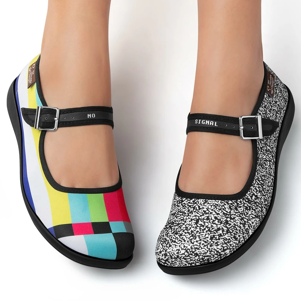 Chocolaticas® No Signal Women’s Mary Jane Flat Shoes. These gorgeous mismatched one multicolour geometric print, and black and white static print fabric shoes are proudly vegan with a lovely vintage tv theme. Featuring a non-marking black rubber sole, you also get the comfort of a cushioned inner sole. You’ll fall in love with these stunning shoes which feature an adjustable buckle and printed fabric upper.