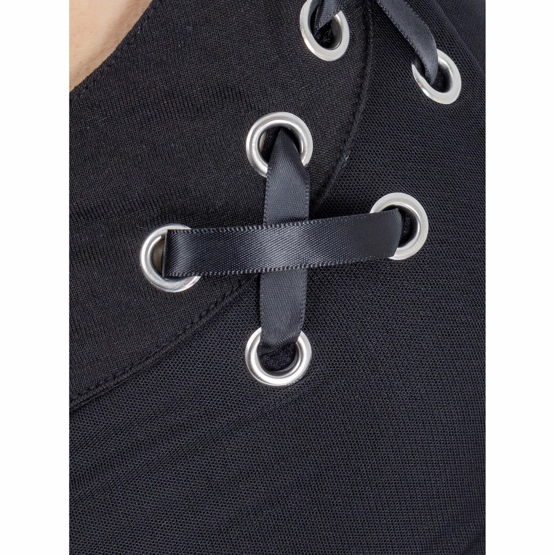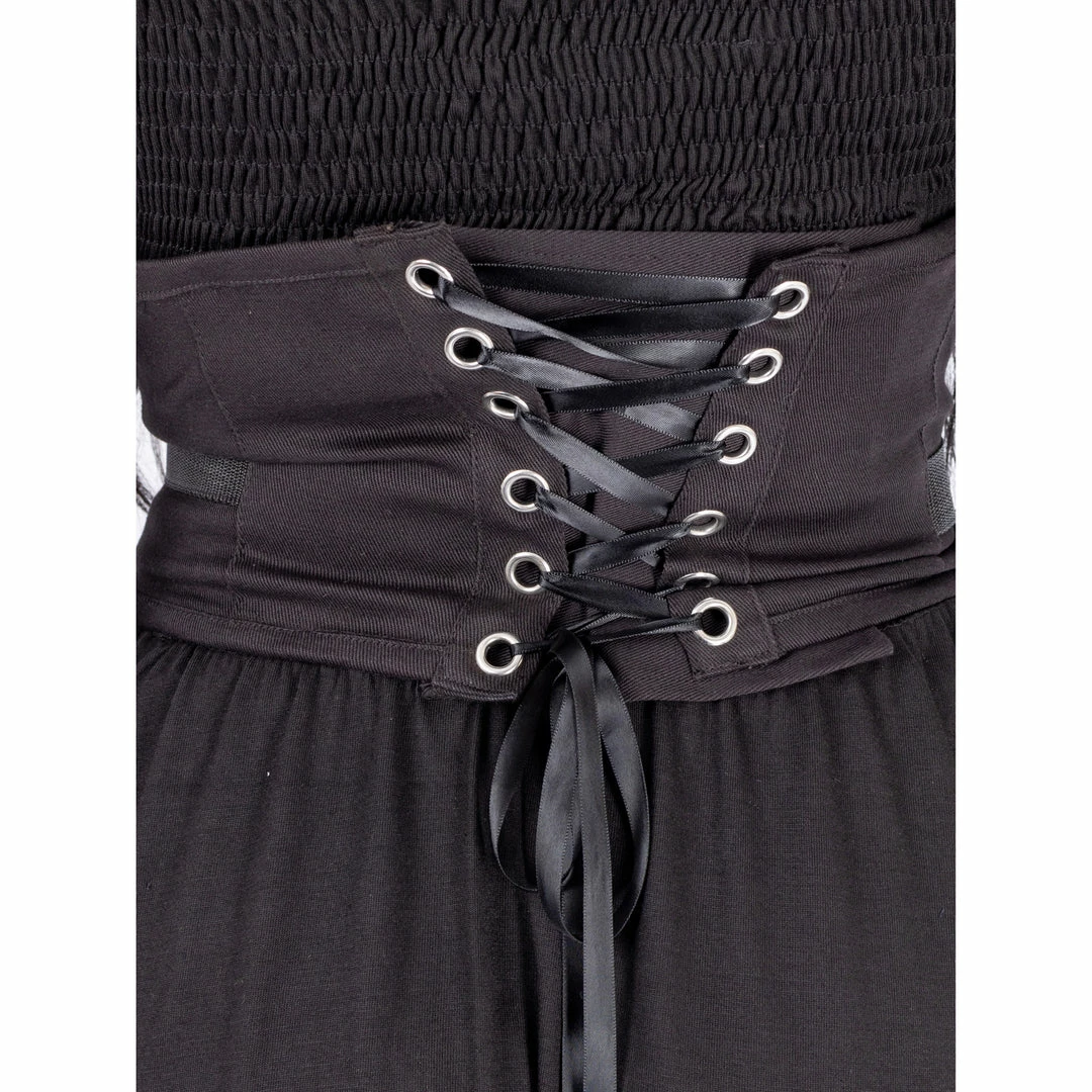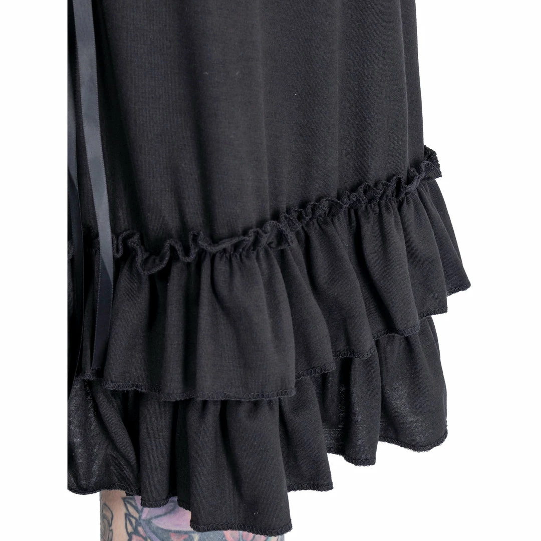 Gorgeous gothic black midi dress from Innocent with front zip up corset belt with back lacing to accentuate your curves. This lovely sleeveless dress features a floaty mid lnegth skirt with ruffle hems and eyelet detailing!