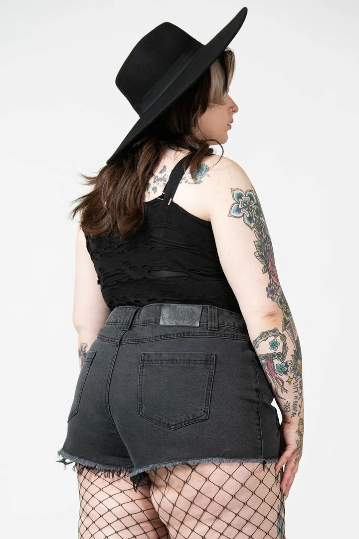 Stunning denim shorts from Killstar featuring floral embroidery and distress detailing. Fastening with zip & button, these lovely shorts have pockets front and back.