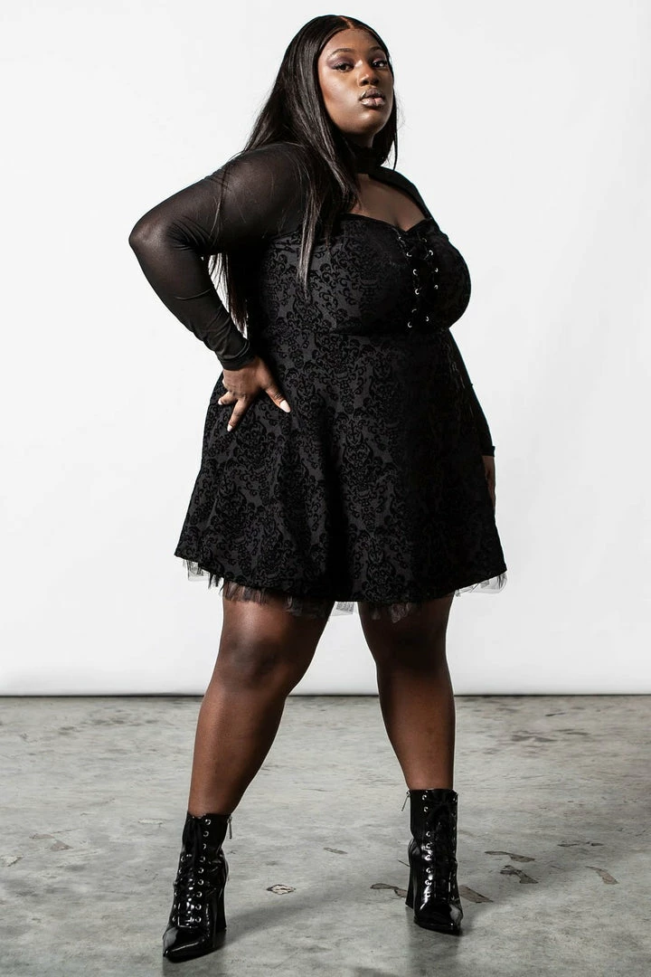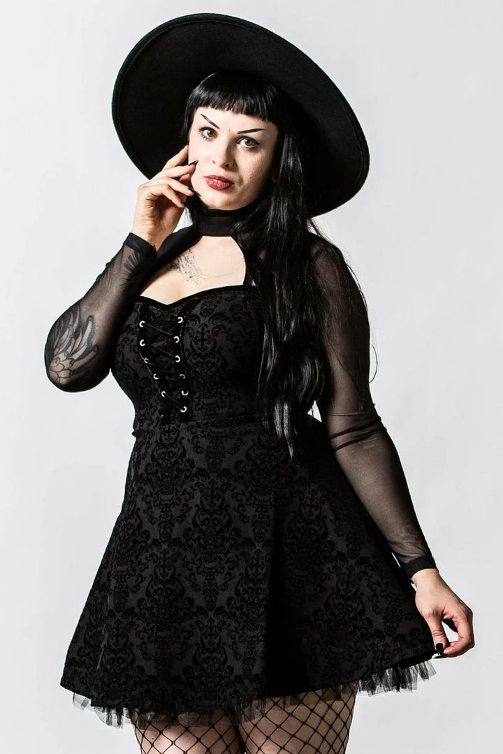 Showstopping black velvet mini dress from Killstar! This stunning LBD is made from a luxury soft stretchy burnout velvet fabric that is fitted to accentuate your figure. This amazing black party dress features a high neck with keyhole detail, lace up front and long mesh fitted sleeves. Beautiful and glamorous, this dress has a nipped in waist and flowing style skirt.
