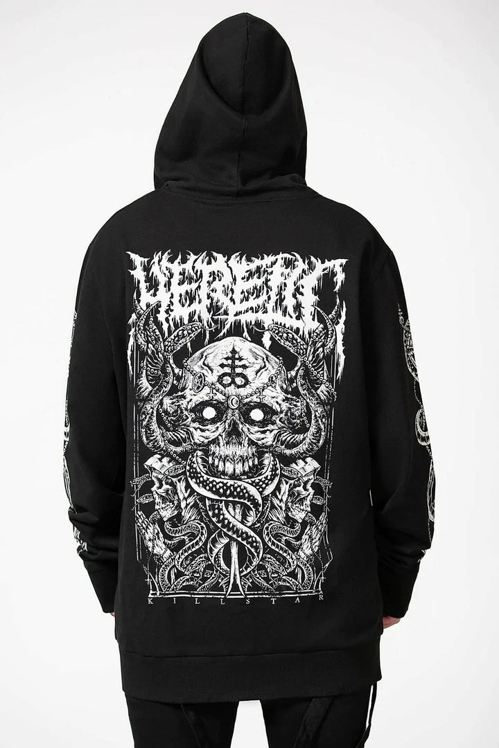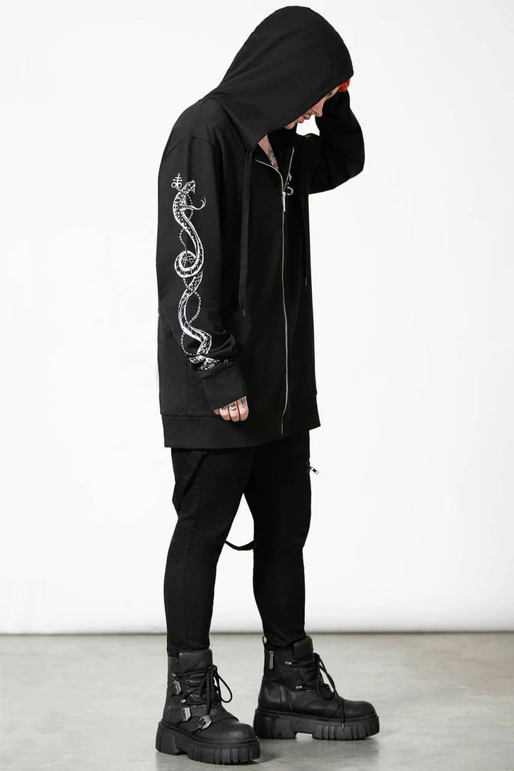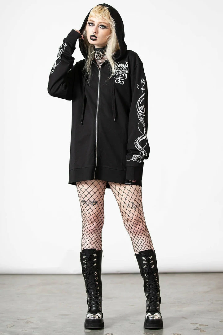 This versatile and stylish black zip up hoodie from Killstar features a relaxed fit that looks great on everyone with oversized hood, long printed sleeves and extra-long body; perfect for layering. Made from a super soft cotton fabric with white contrast statement print on the back, front and sleeves. Dress it up or down with ease! The perfect wardrobe must-have.