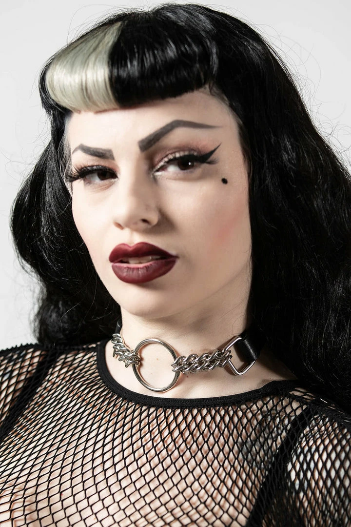 Edgy black choker by Killstar that is made from vegan leather with accent chains and O-ring detail. Complete your look with this provocative choker with fully adjustable back and faux leather body!