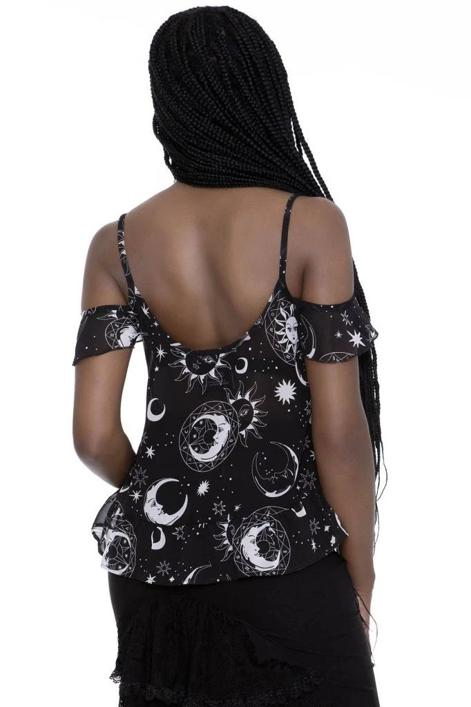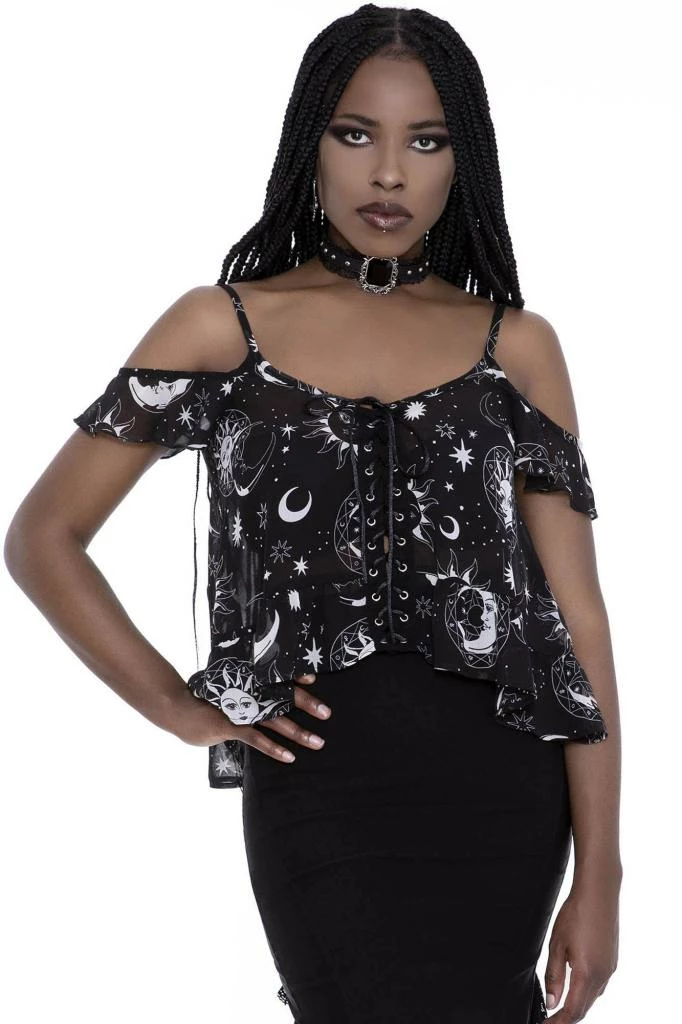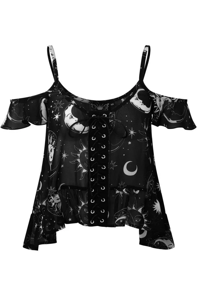 Floaty chiffon cold shoulder top by Killstar in their Astral Light print featuring vintage styles suns and moons. It has a high low hemline with corset inspired front lacing and spaghetti straps with cold shoulder cuffs.