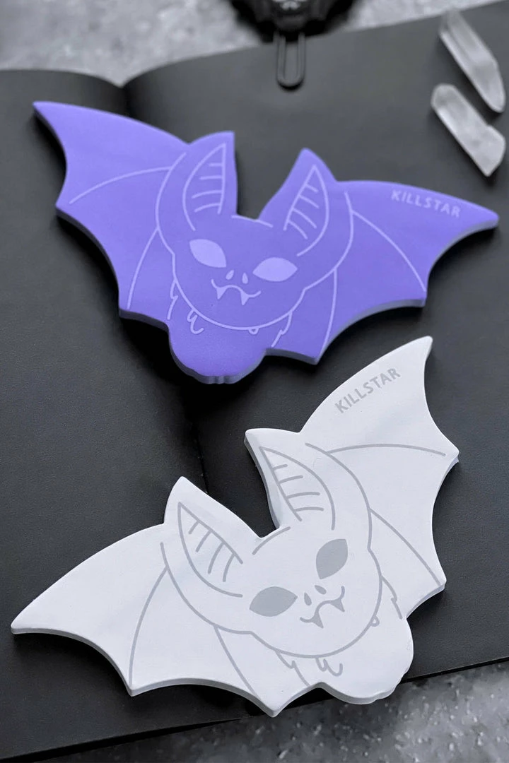 Bat shaped sticky notes in lilac and white with custom Killstar design. Perfect for your to-do list! Makes a great spooky gift!