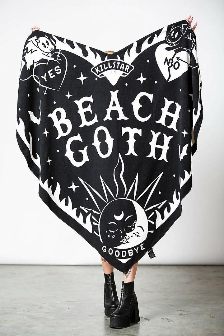 Unique Beach Towel in black and white from Killstar with “Beach Goth” script for the ultimate gothic beach towel! This extra large black and white heart shaped beach towel is perfect for laying out! Sumptuously soft beach towel from Killstar, featuring a bold contrast graphic – the short, lightweight pile ensures it folds down to a compact size for ease of packing and dries rapidly.