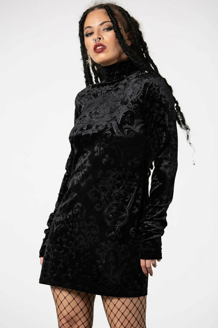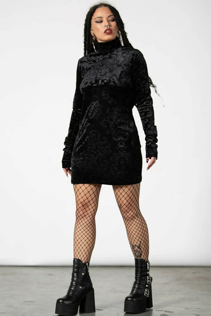 Stunning black long sleeved mini dress by Killstar that is made from a luxury soft stretchy burnout velvet fabric in a fitted style that flatters your figure! This gorgeous dress features a high neck and lovely long sleeves! Looks amazing dressed up or down!