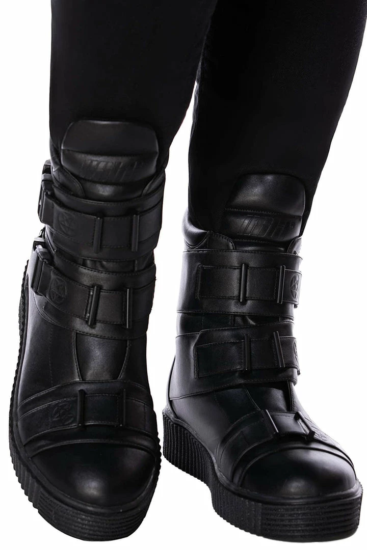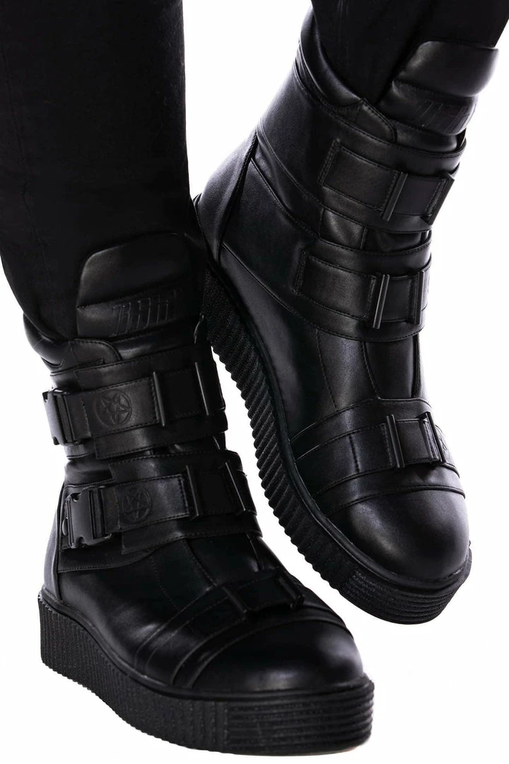 Killstar Briar Unisex Black Trainers perfectly combine the look of boots with the comfort of trainers. These must-have high tops are made from faux leather with thick soles. They also feature monochrome black hardware with pentagram details and buckle closing! Easy to wear everyday with a striking design!