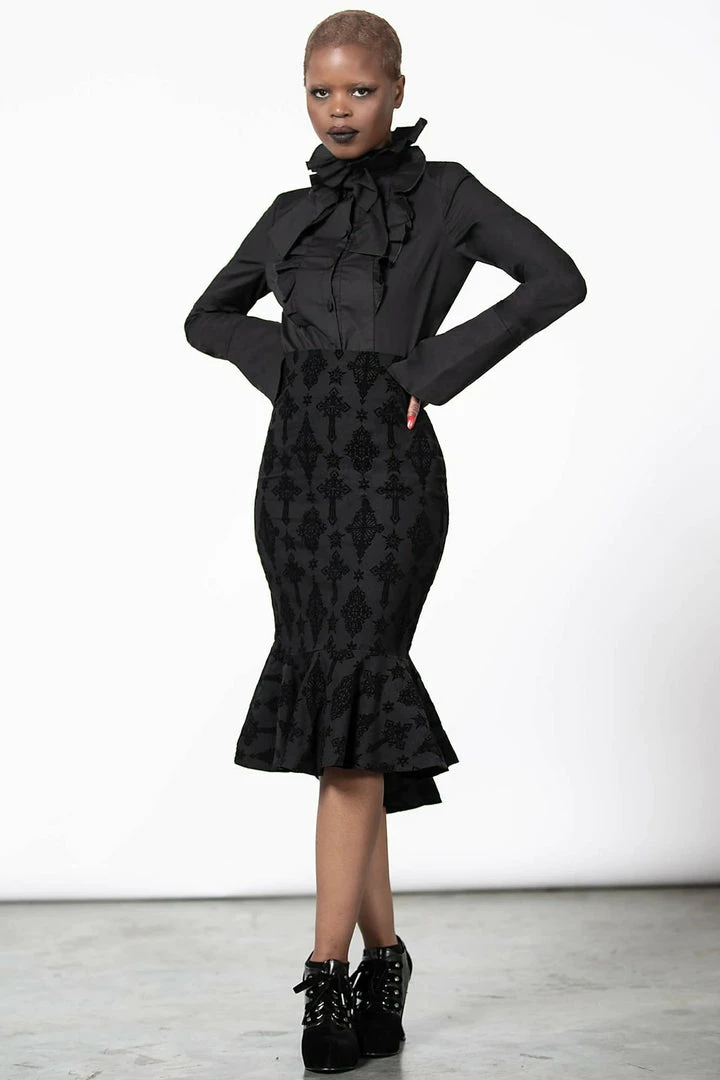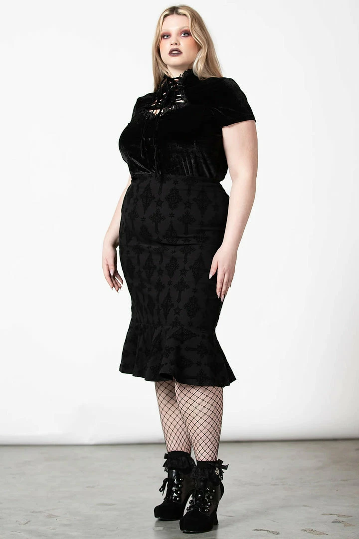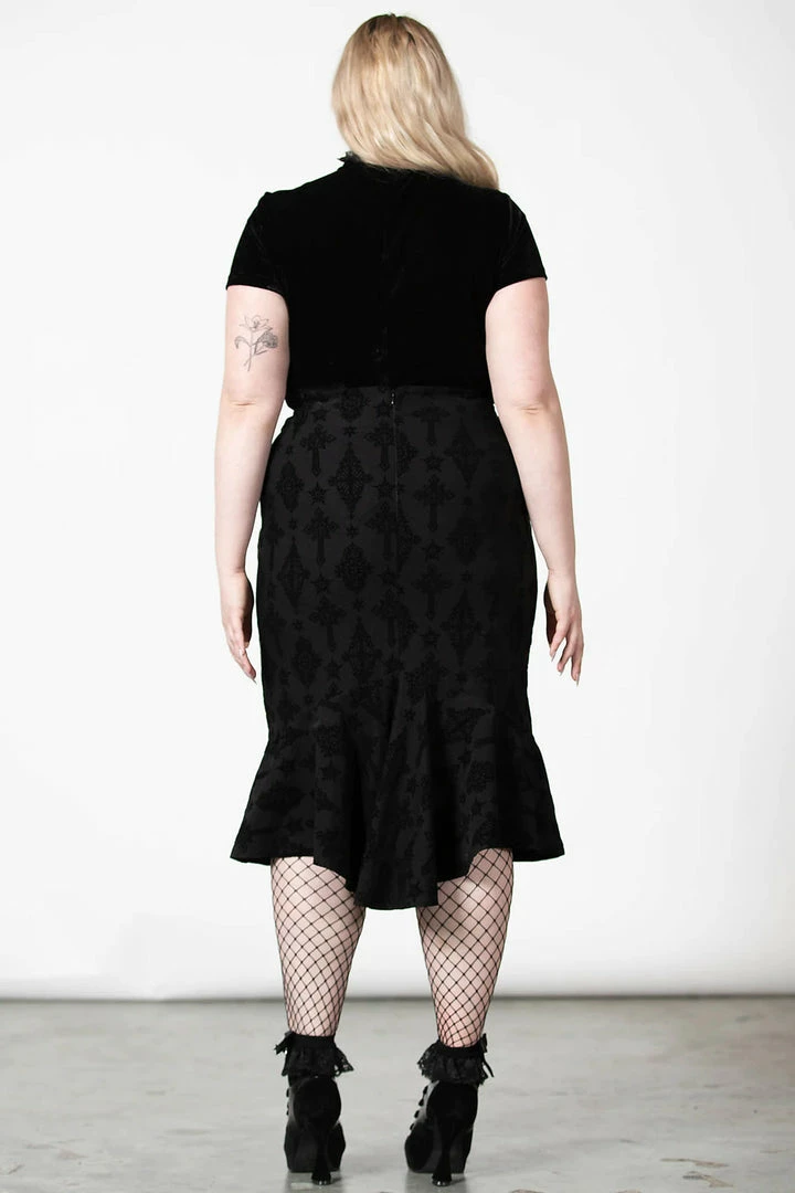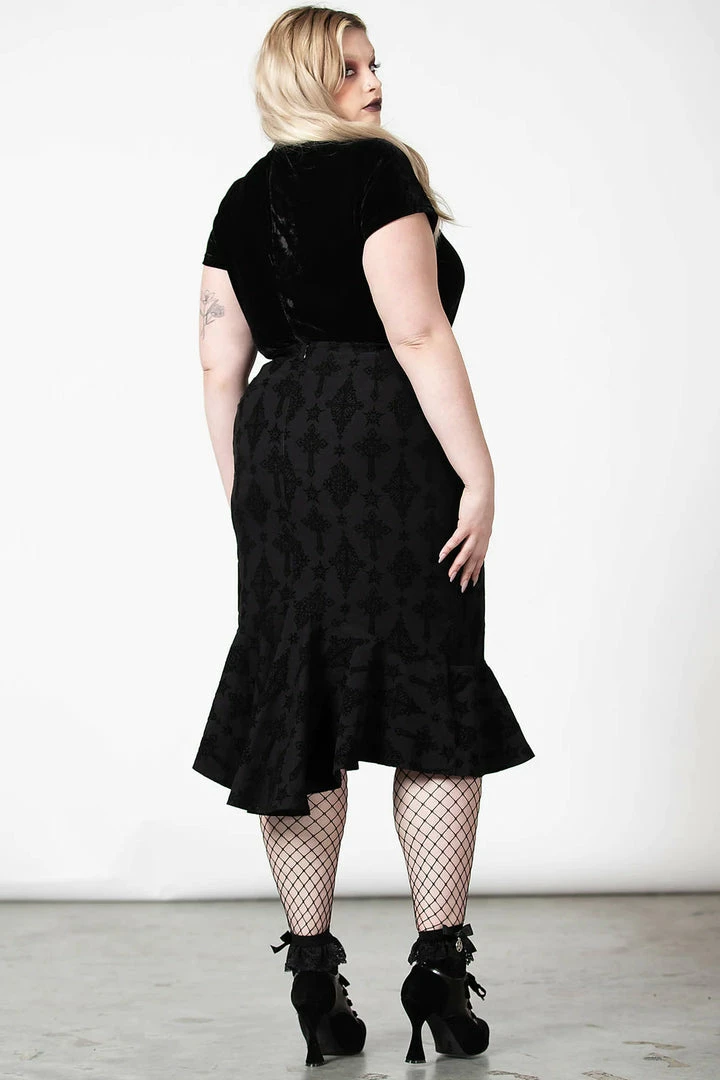 Beautiful black flocked fishtail midi skirt from Killstar that is made from a super soft stretchy fabric with ruffled flared hem for a feminine flattering style. This must-have skirt also features a hidden back zip for fastening and a statement flocked cross pattern for stand out style with a vintage gothic feel!
