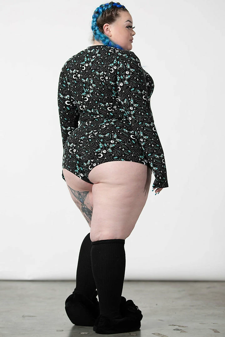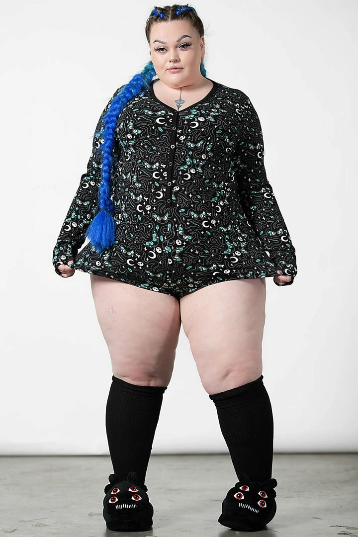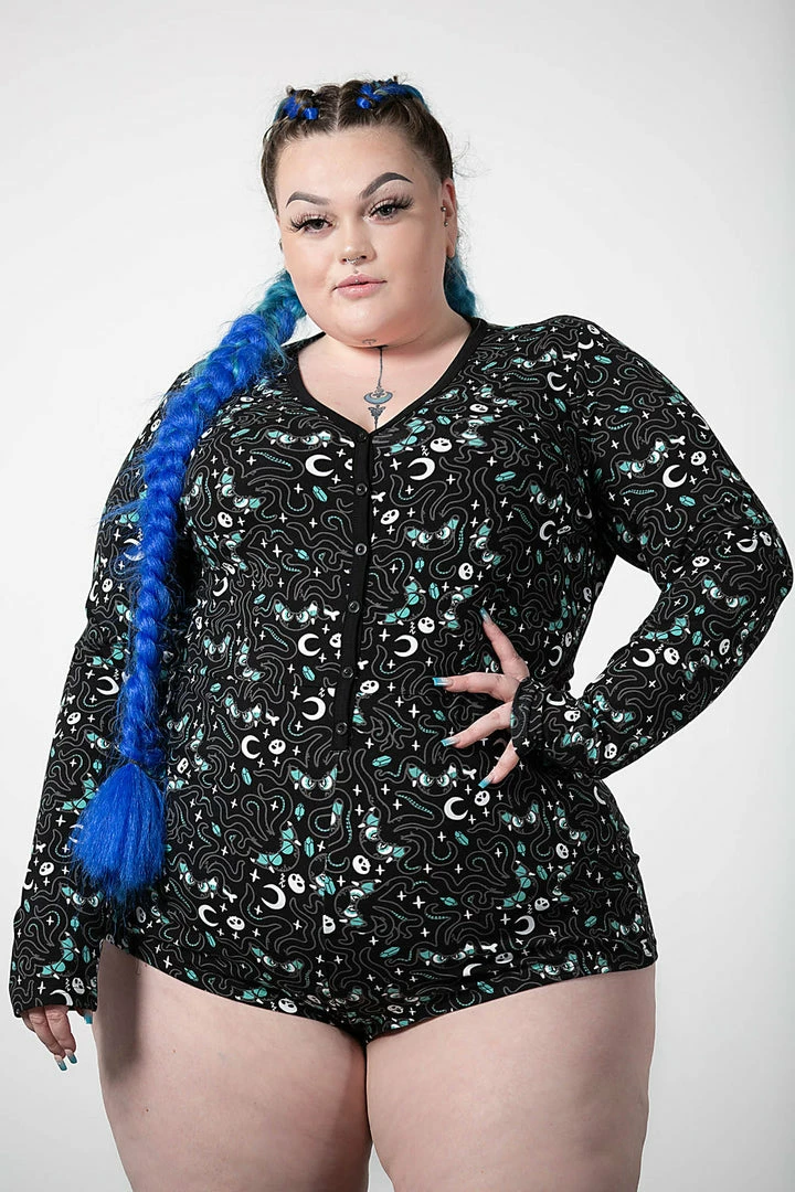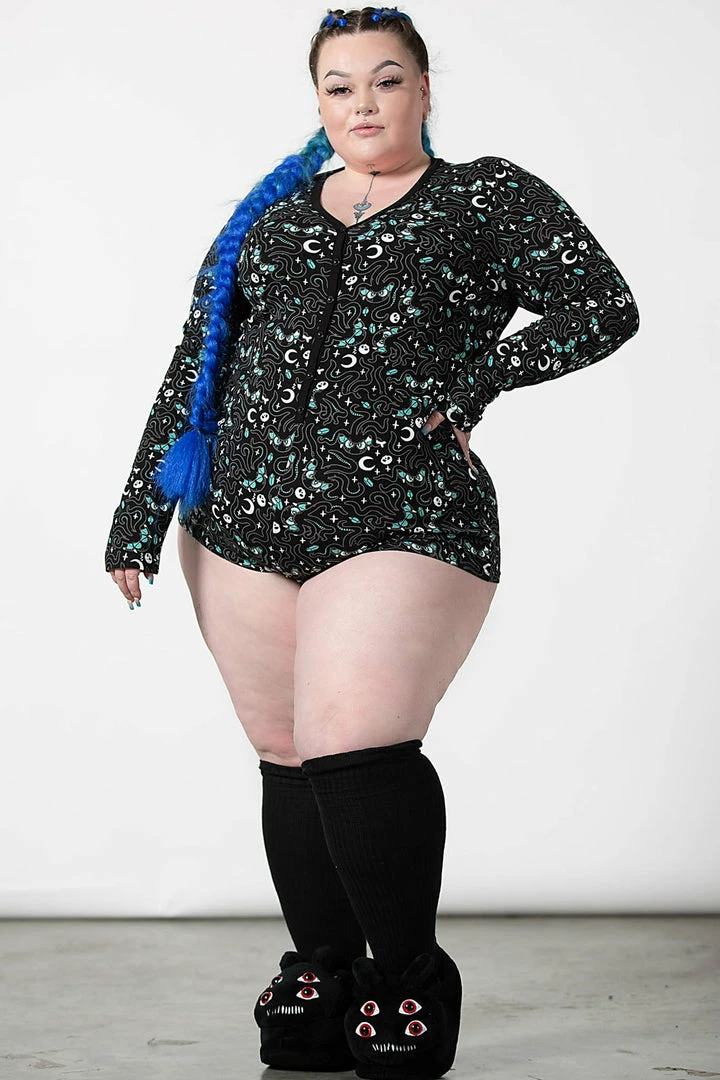 Playful and stylish black playsuit with awesome contrast Cthulhu print by Killstar. This terrifyingly adorable sleepwear is made from a super soft smooth stretch cotton fabric with long sleeves and button up front for the ultimate sleep comfort. This fun printed black short onesie matches perfectly with other items from the Cthulhu collection!