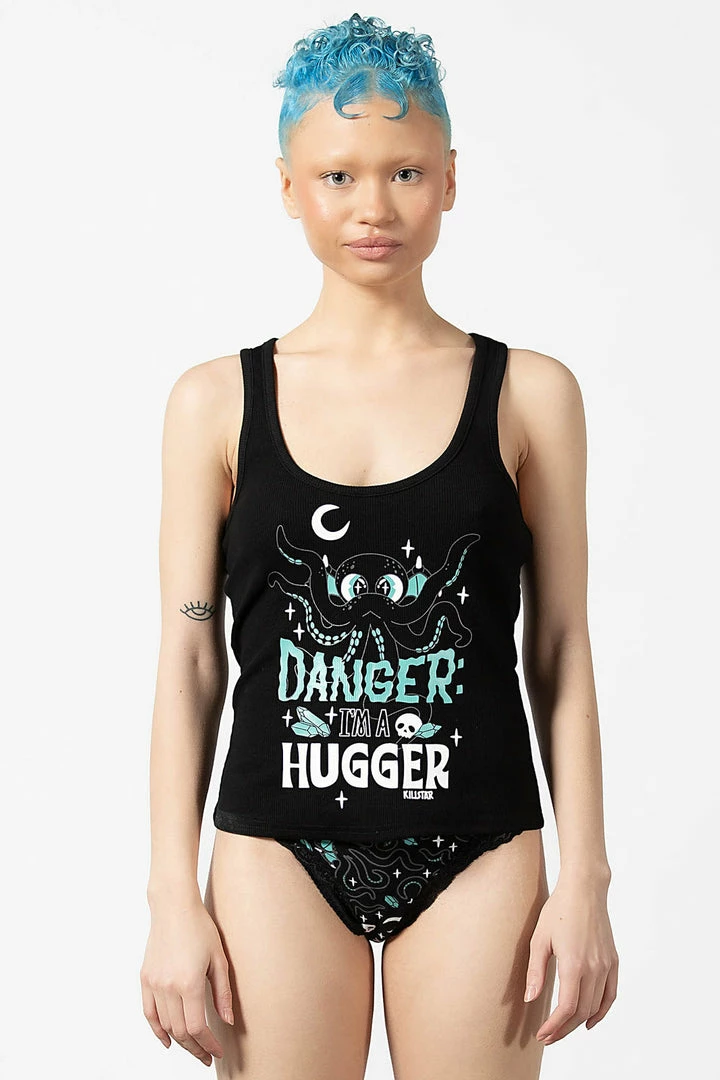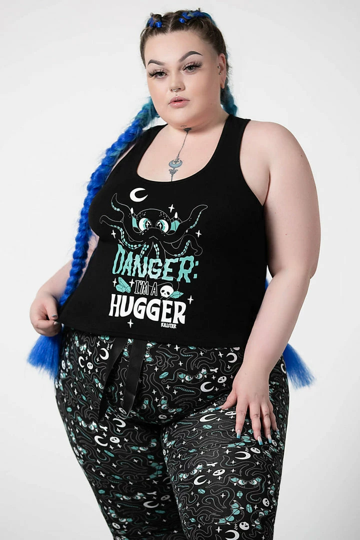 Playful and stylish black ribbed vest top with awesome contrast Cthulhu print by Killstar. This terrifyingly adorable top is made from a super soft cotton fabric with racer back and “Danger I’m a Hugger” script. This fun and comfy top features a fun print and matches perfectly with other items from the Cthulhu collection!