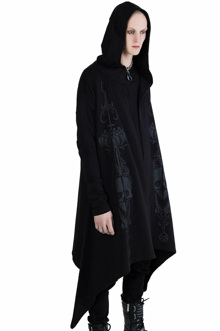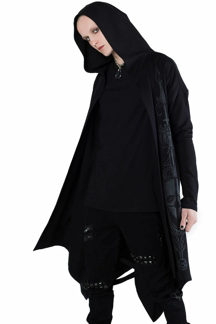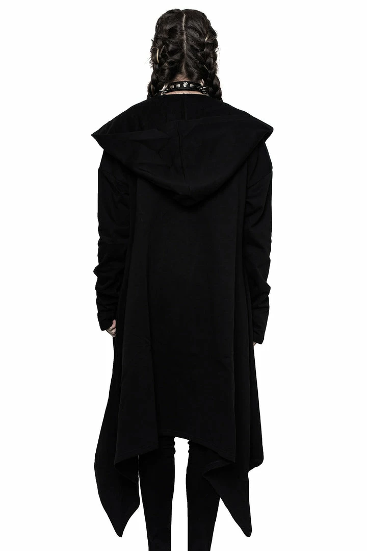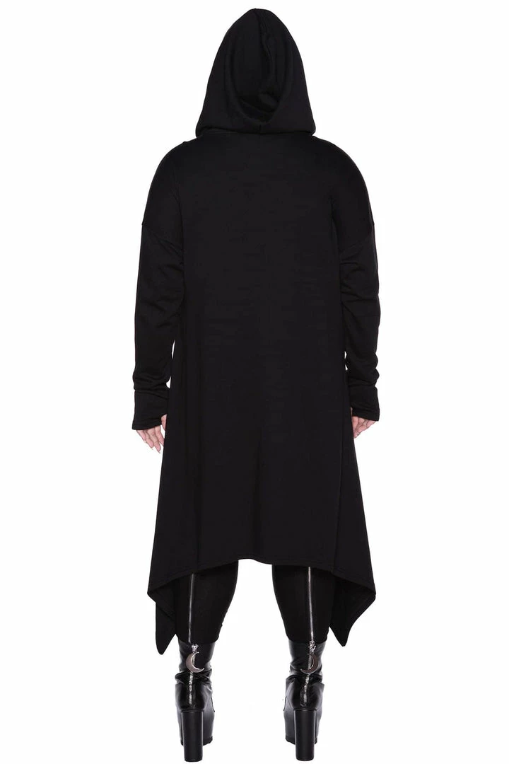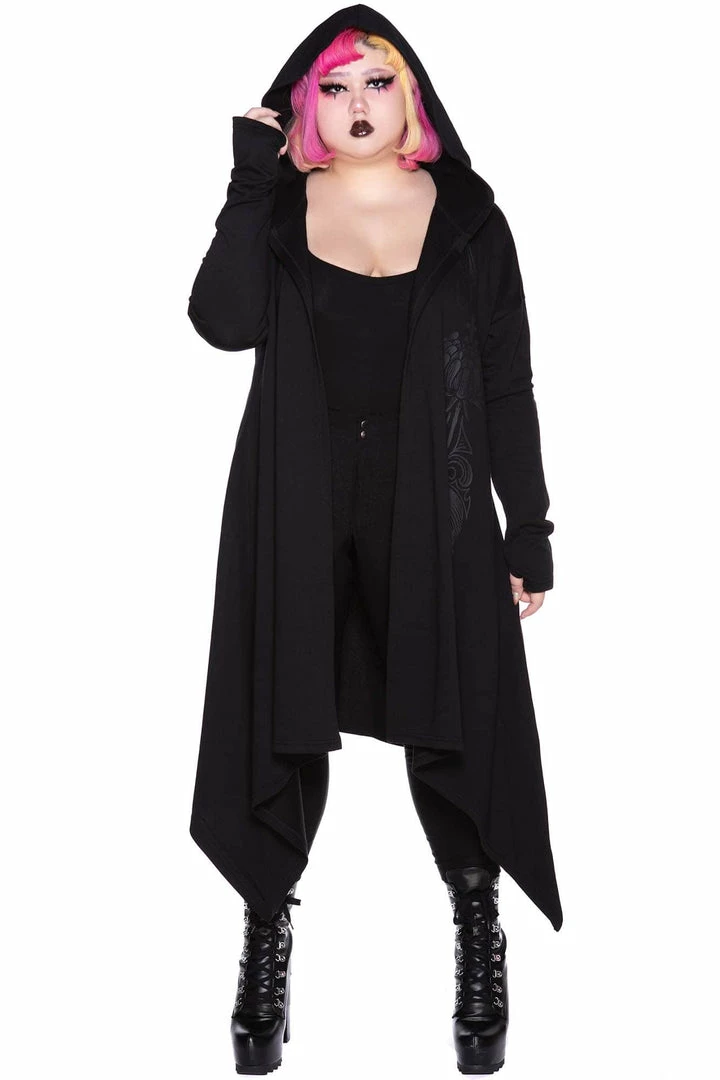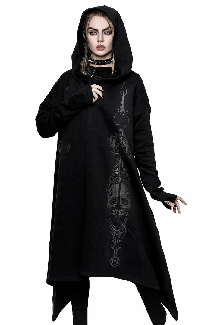 Killstar Death Ray Unisex Black Hood Jacket is made from a super soft fabric with a relaxed fit that looks good on everyone! This versatile Black hooded jacket features an oversized hood, thumbholes, hanky hem and statement black on black graphic. This is a must-have jacket that goes with everything for everyone!