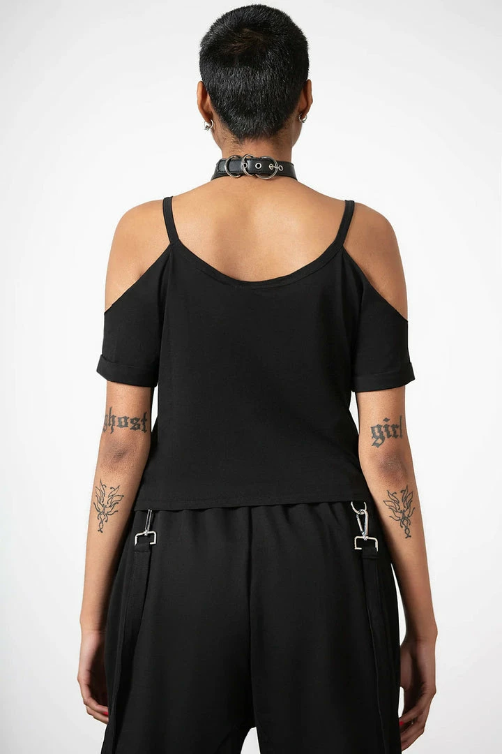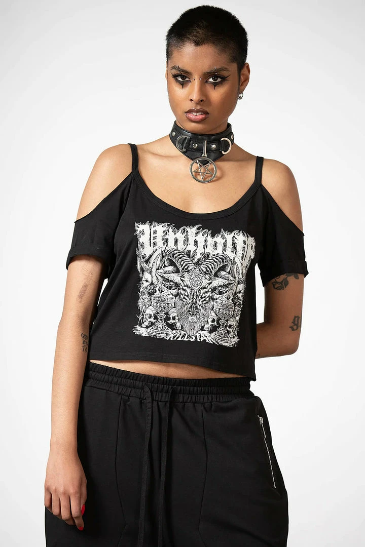 Relaxed and stylish black cropped t shirt with awesome contrast white print by Killstar. This stunning top is made from a super soft cotton fabric with cold shoulders and a relaxed fit. Easy to dress up or down, this is your new wardrobe essential!