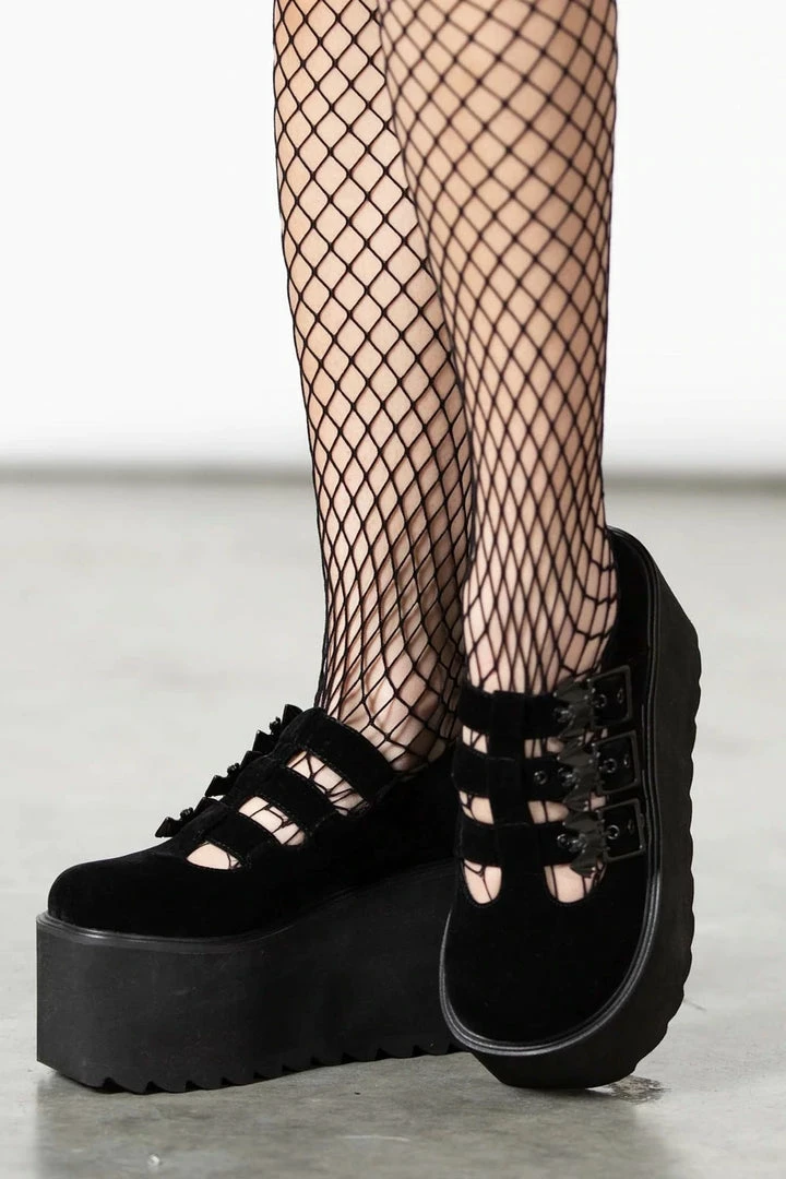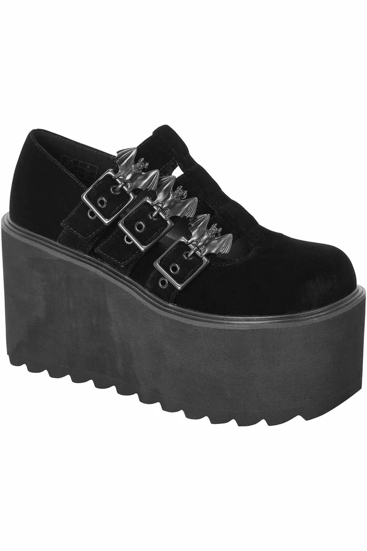Elevate your look with these must-have platform black mary jane shoes from Killstar. These stunning black brushed velvet shoes feature adjustable buckles with silver metal hardware bats and a super chunky platform sole.