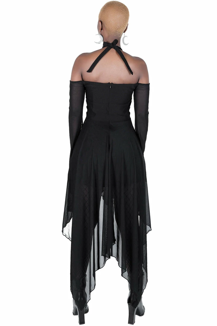 Gorgeous floaty black dress from Killstar with statement mesh bell sleeves and hanky hem! This stunning dress is made from a super soft stretchy fabric which is fitted to show off those curves! Also features cold shoulders and halter neck with lace up and strap detailing! Looks amazing on!