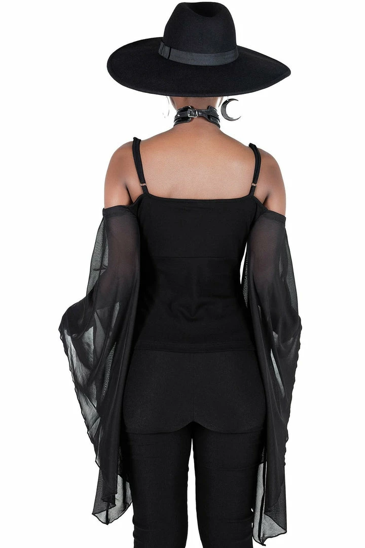 Gorgeous romantic black long sleeved top from Killstar with bardot neckline and thin straps! This beautiful and elegant top is made from a super soft stretchy fabric which is fitted to show off those curves! This stunning black top also features long statement waterfall mesh sleeves and lace up details. Looks amazing on!