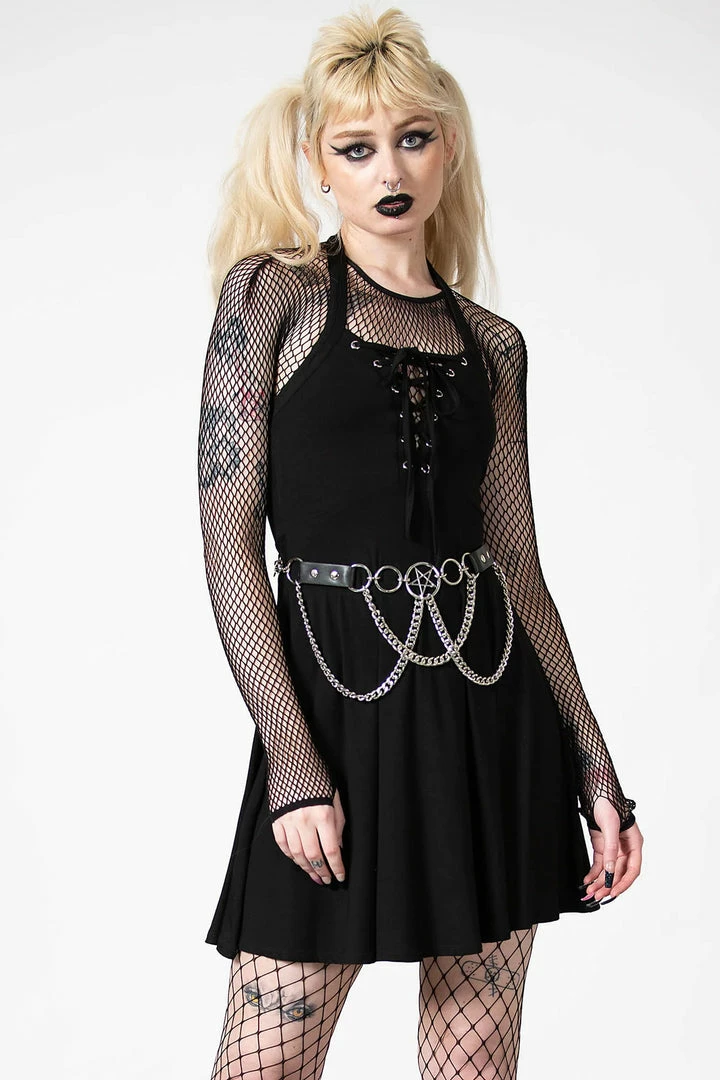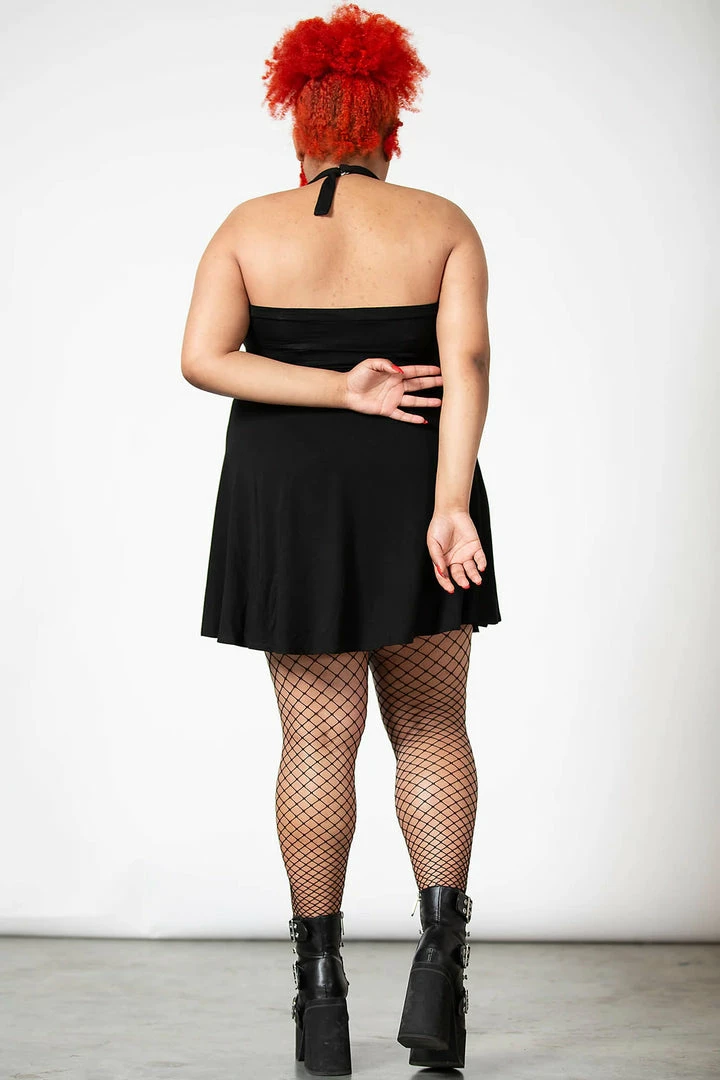 Stunning black halter mini dress from Killstar made from a super soft stretch fabric, fitted to show off those curves with lace up detail on the chest and halterneck with metal D ring design! Made from soft stretch fabric, this lovely A line mini dress flares out from the waist for a flattering fit and is available in a wide range of sizes.