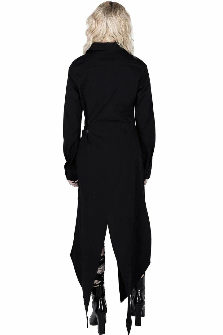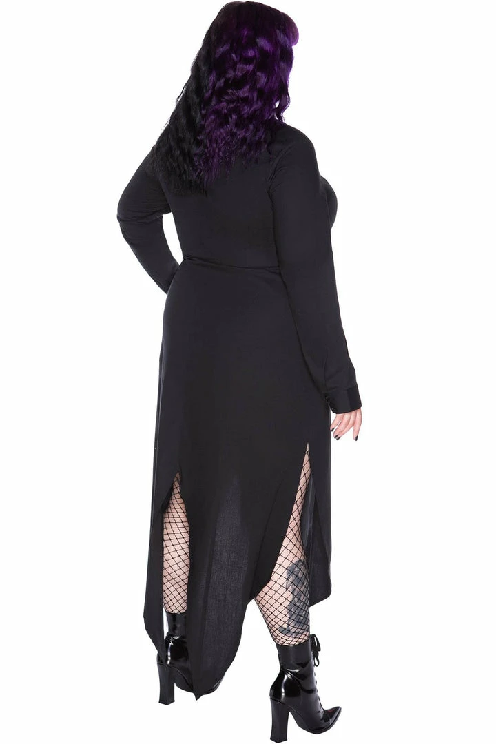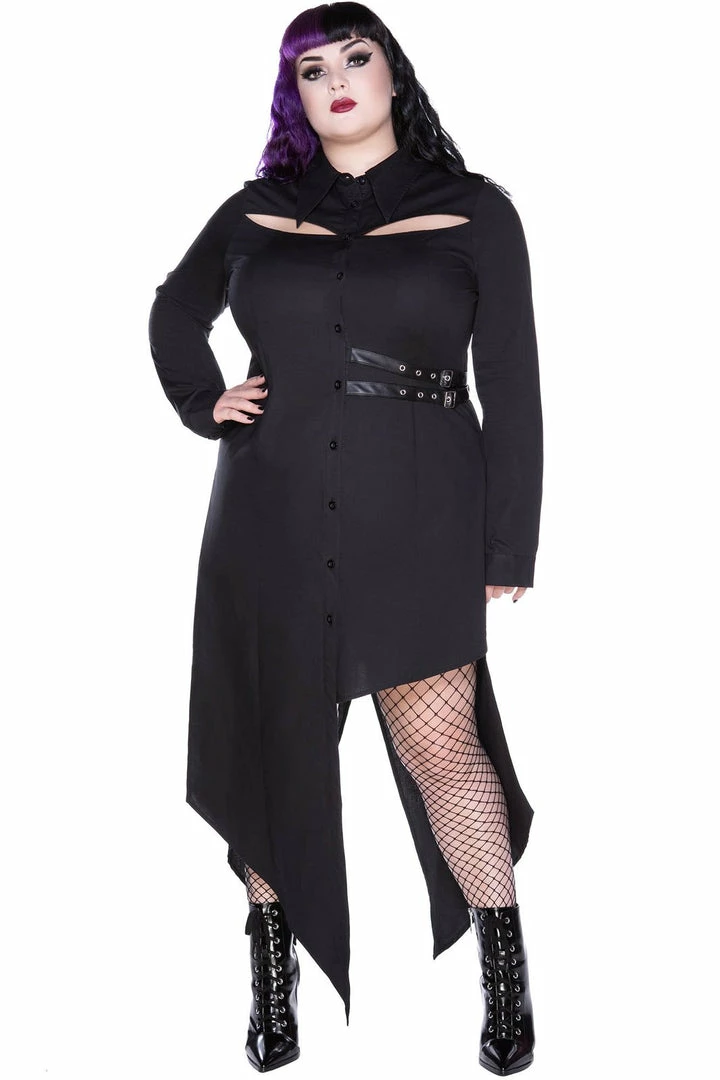 Another awesome long sleeved dress from Killstar, this black shirt dress is a must-have. Channelling an asymmetrical vibe, this dress is made from a soft stretch cotton blend fabric that is fitted to accentuate your figure! This stunning gothic dress also features a button up front, buckle details, cut outs and an exaggerated collar. This asymmetrical black dress will make a dramatic statement!