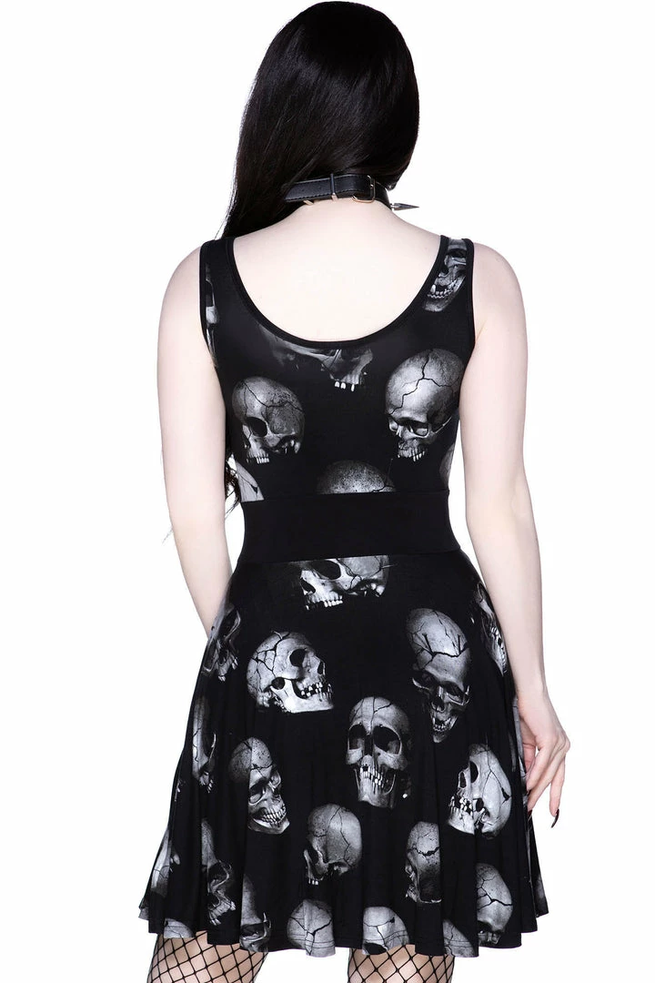 Beautiful sleeveless black mini dress with white contrast skull design from Killstar. This stunning black dress is made from a soft stretchy cotton fabric that is fitted to accentuate your figure. Elegant and edgy, this dress has a nipped in waist and flowing skirt.