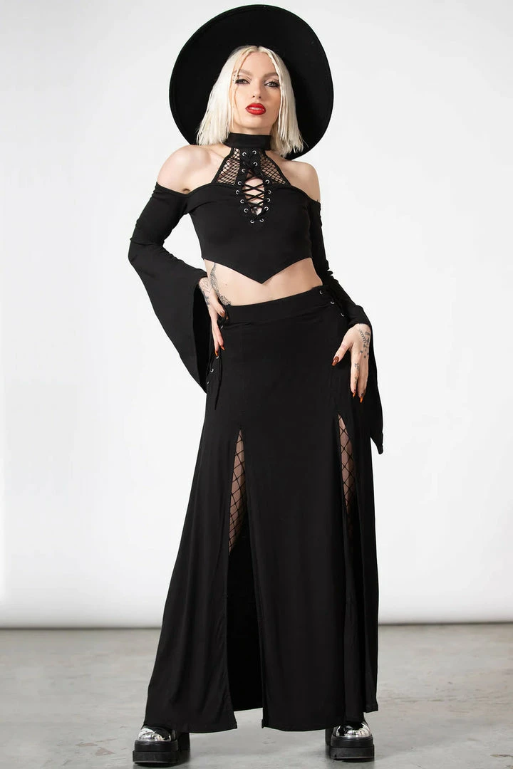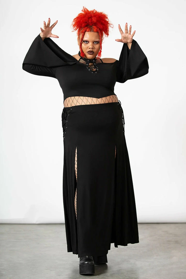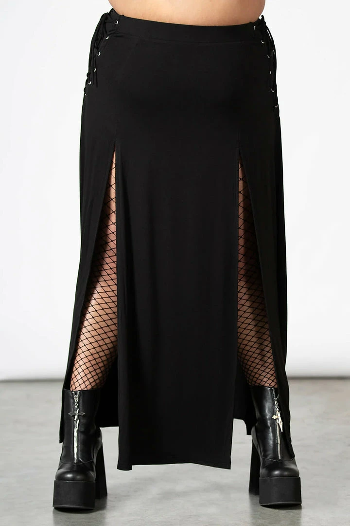 This breathtaking black maxi skirt from Killstar is made from a soft stretch fabric that hugs your curves and drapes to perfection. Totally versatile, this stunning maxi skirt has dramatic splits and adjustable lace up panels on both sides. This beautiful black fitted maxi skirt has a wide elasticated waist for comfort and is sure to turn heads!