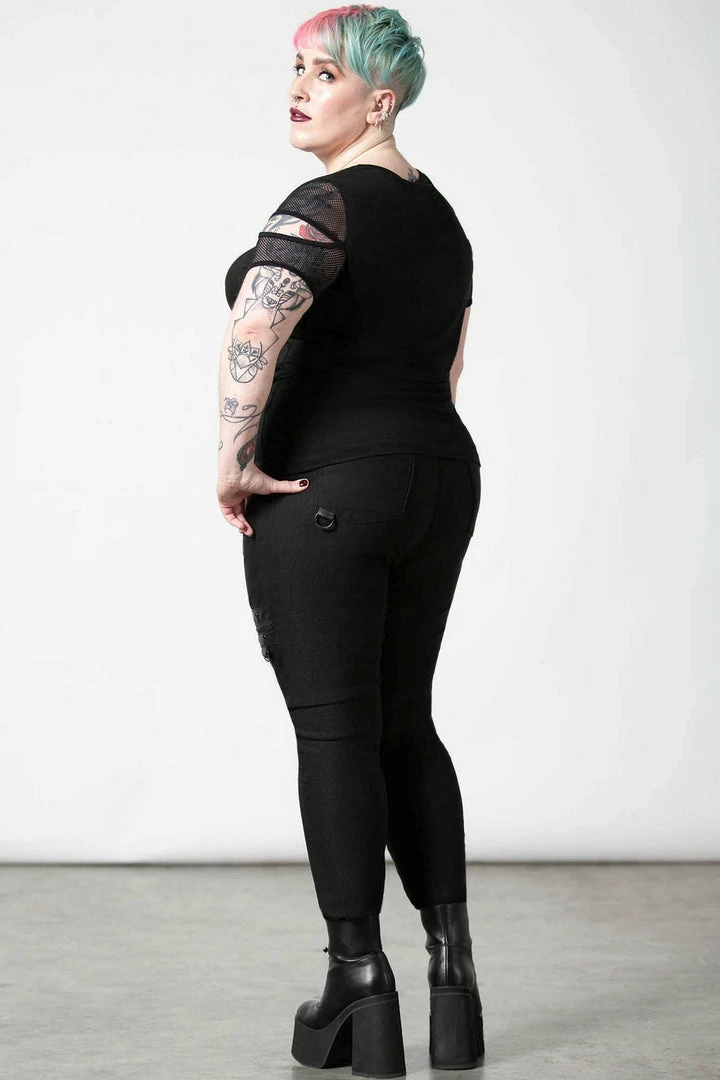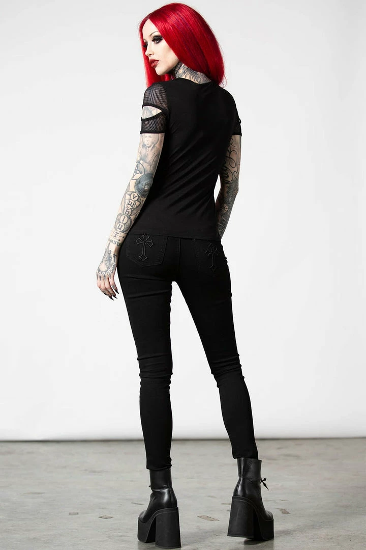 Gorgeous short sleeve black top with keyhole details. This stunning top by Killstar is made from a soft stretch fabric that is fitted to hug your figure. It also features fishnet underlays and stylish sleeve detailing.