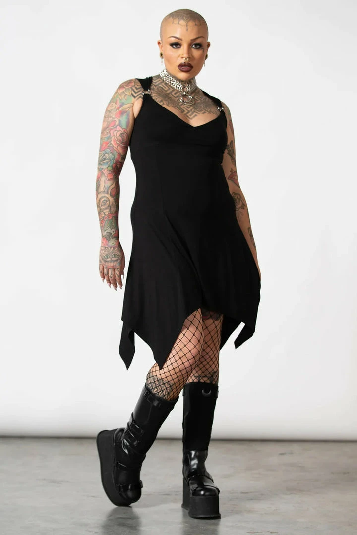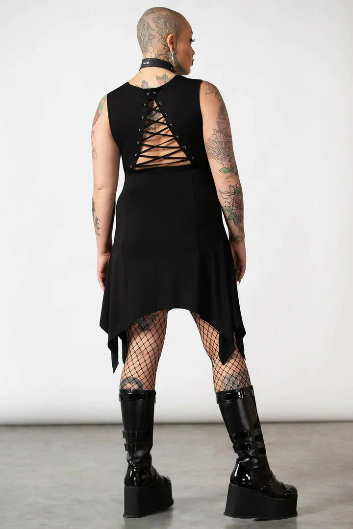 Showstopping black dress from Killstar! This stunning mini dress is made from a luxury soft stretchy fabric that is fitted to accentuate your figure with a hanky hem and stunning lace up back. This amazing black party dress features shoulder straps with metal hardware details. Beautiful and glamorous, this dress has a nipped in waist and flowing a line skirt.
