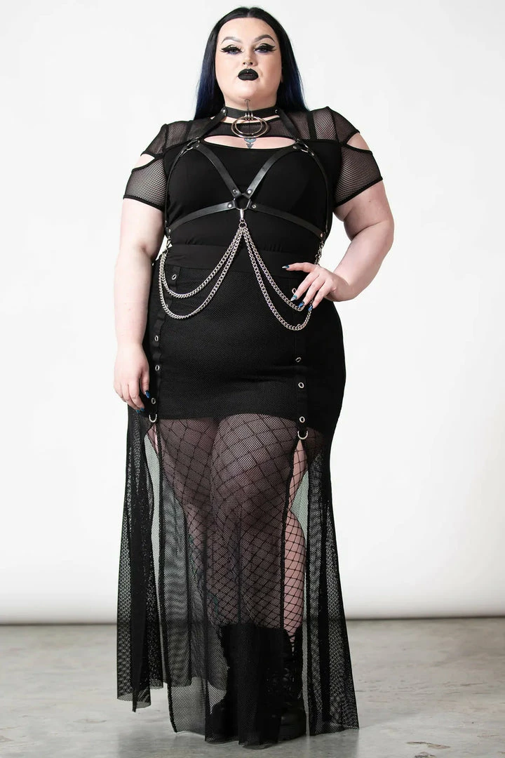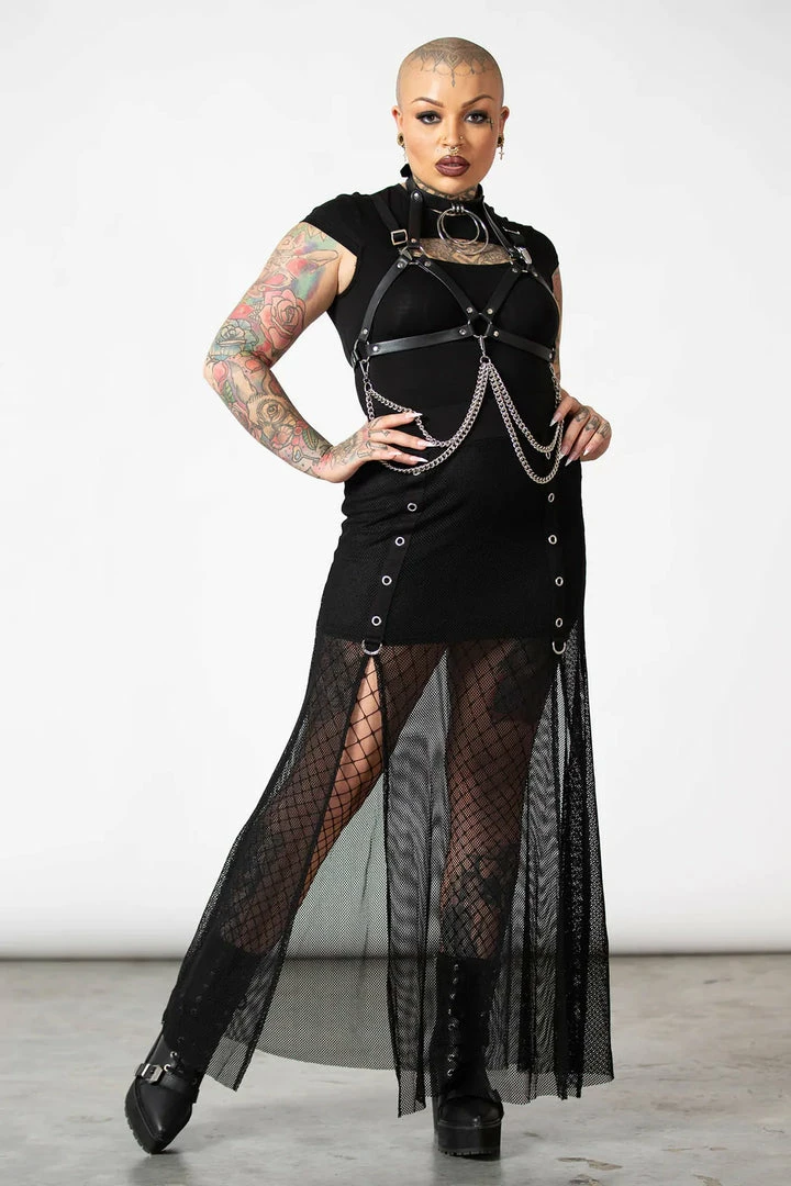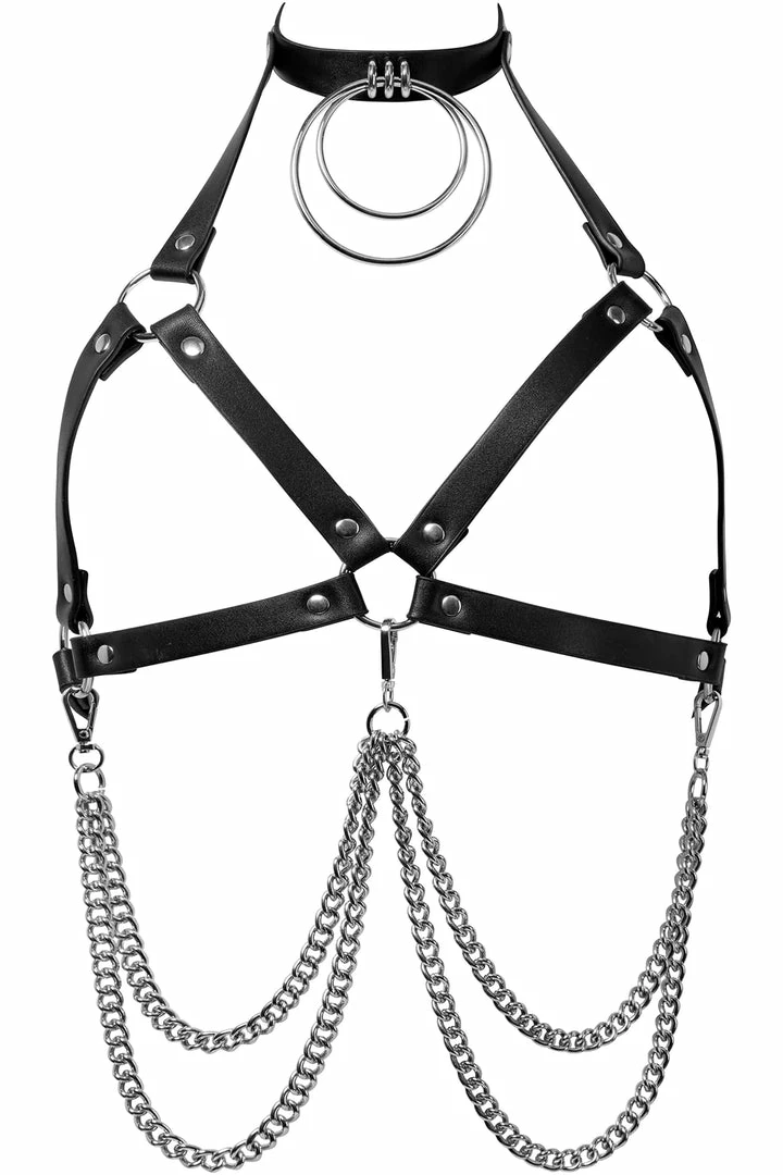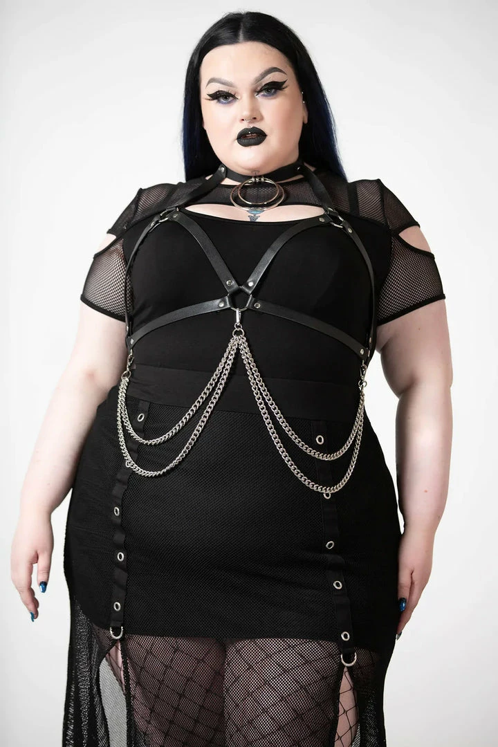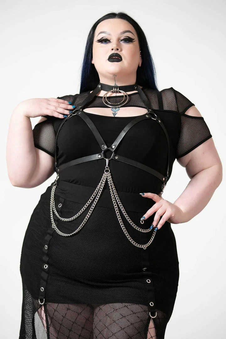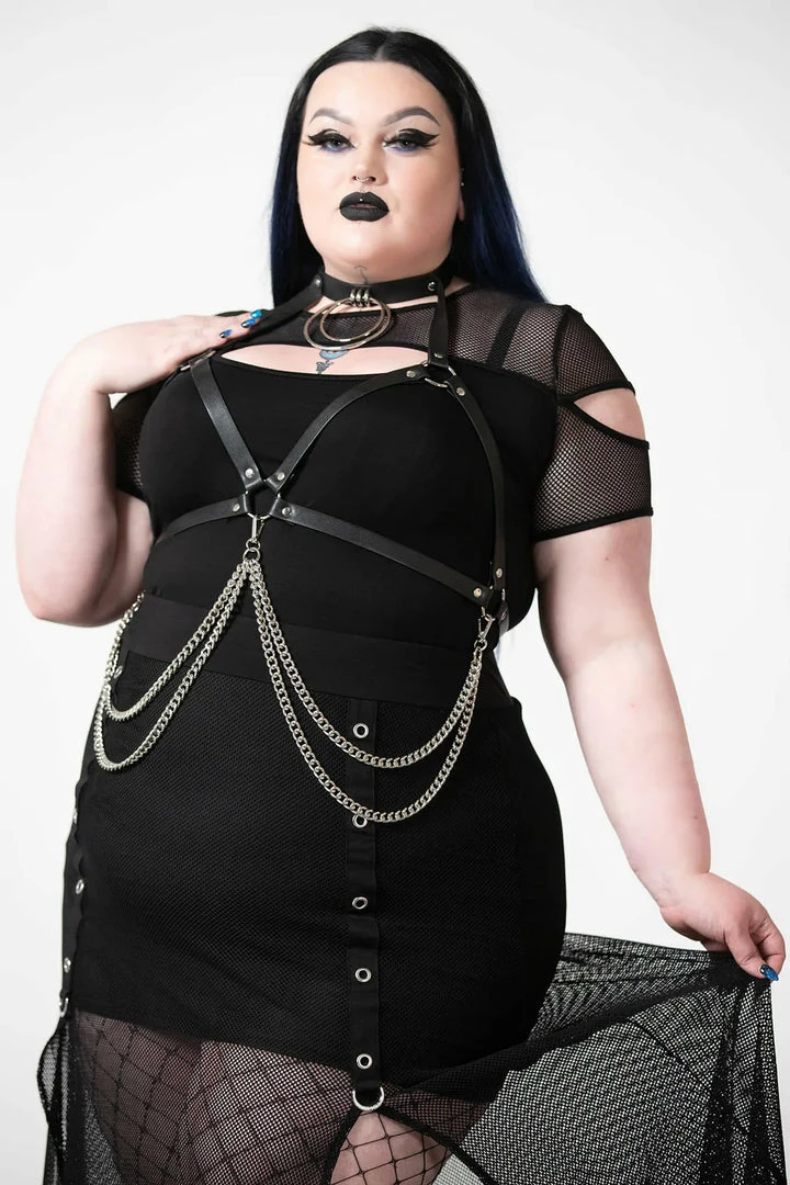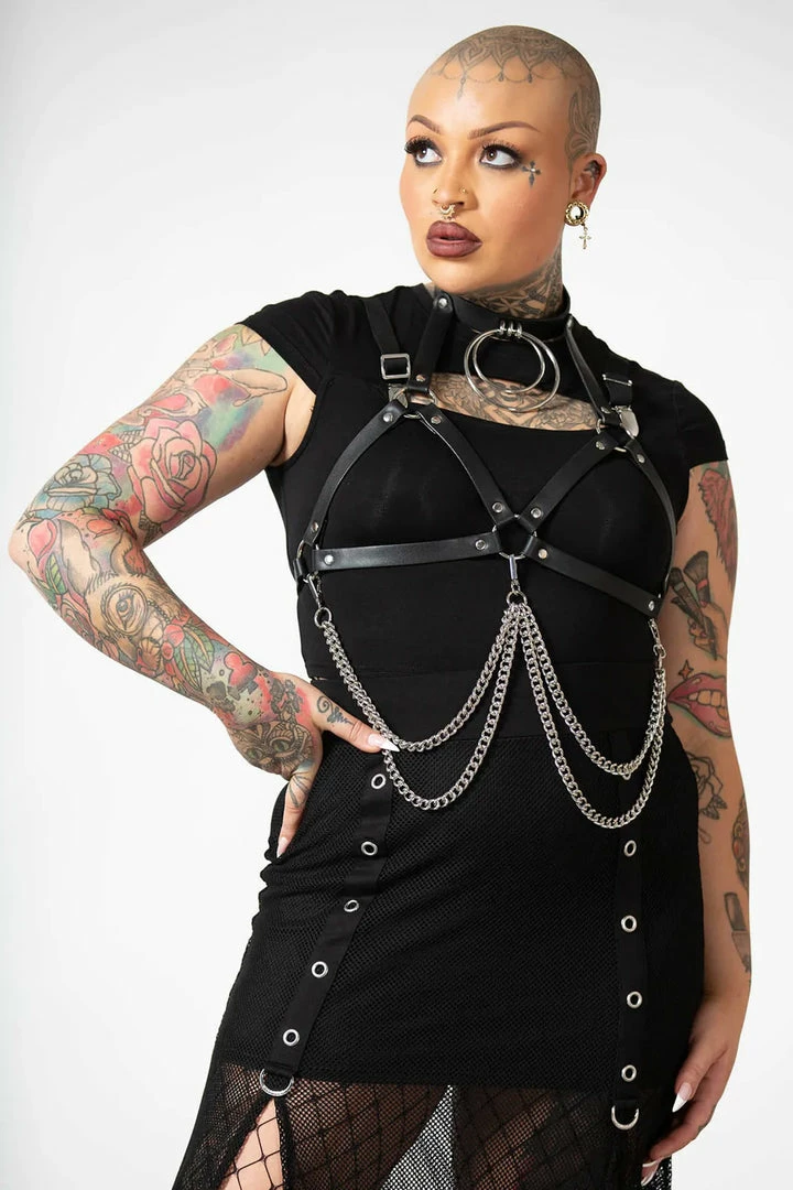Push them to the edge and complete your look with this statement chain harness from Killstar! Featuring a soft faux-leather body with double O ring choker, chest strap, metal hardware and detachable chains. Adjustable size. Add onto any outfit to create instant drama!
