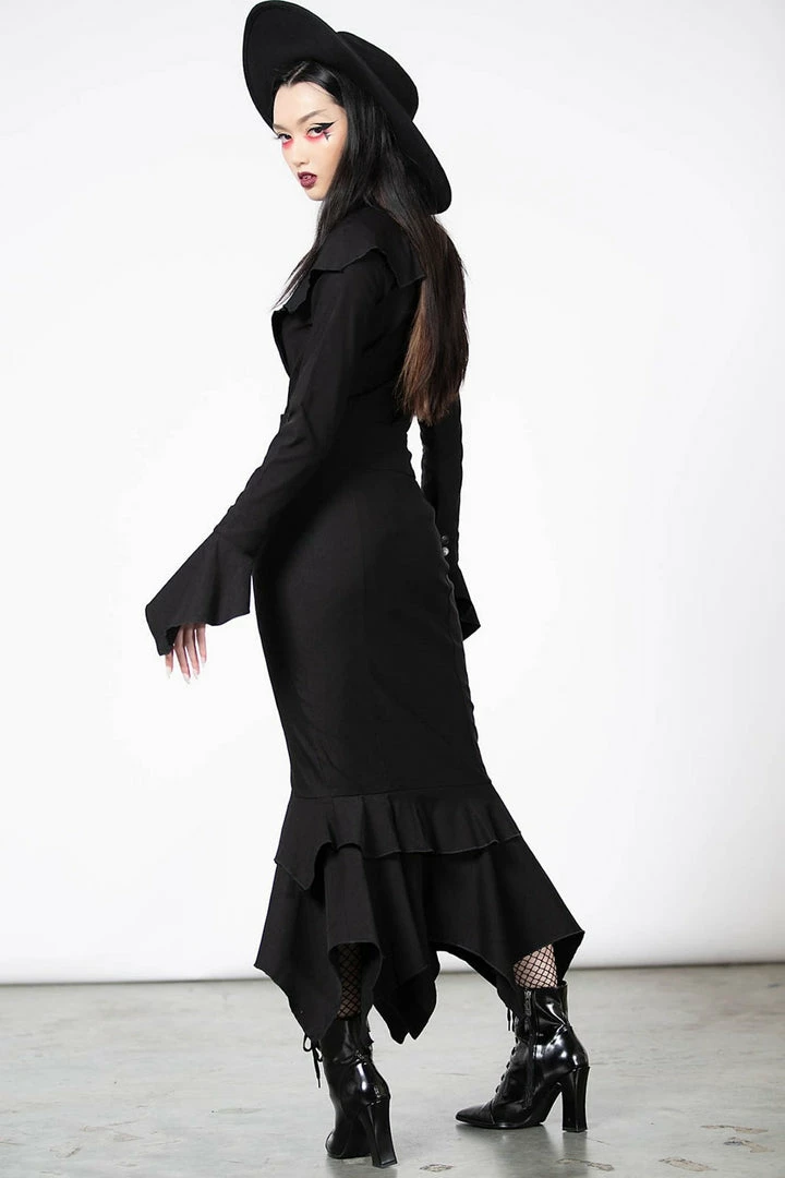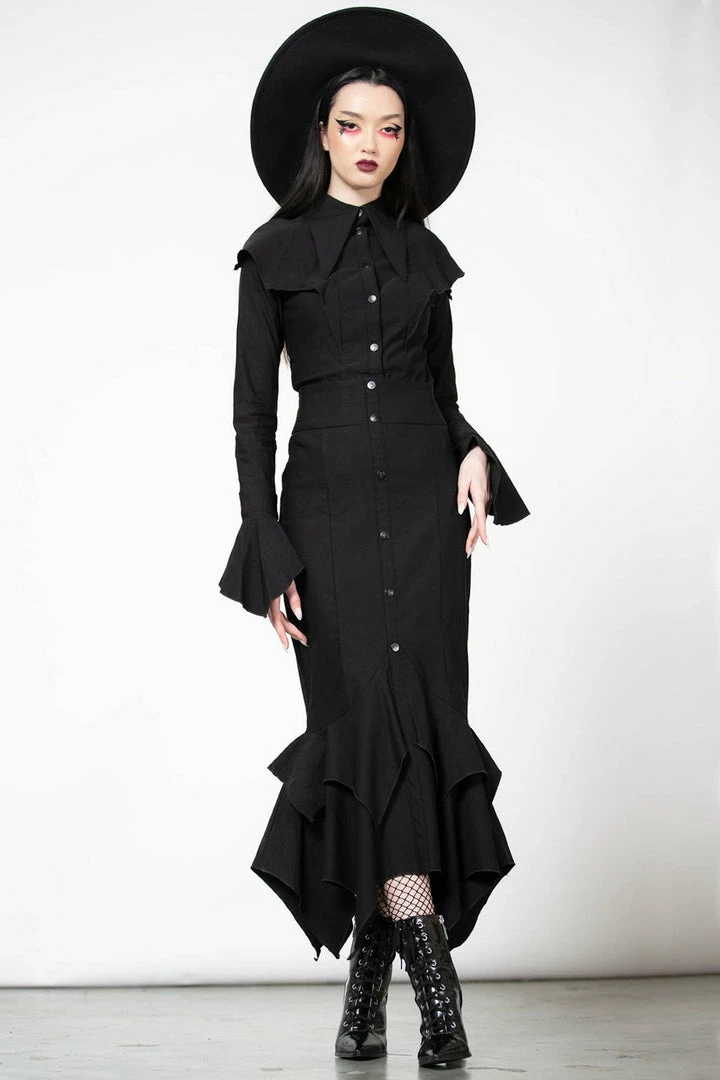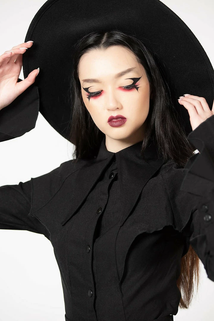 Elegant and delicate long sleeve black button up shirt from Killstar! This gorgeous long sleeve fitted blouse is made from a a soft stretchy fabric with extra large ruffled collar collar! This beautiful blouse has a hemline that will reach to your hips and also features long cuffed sleeves and looks amazing on!