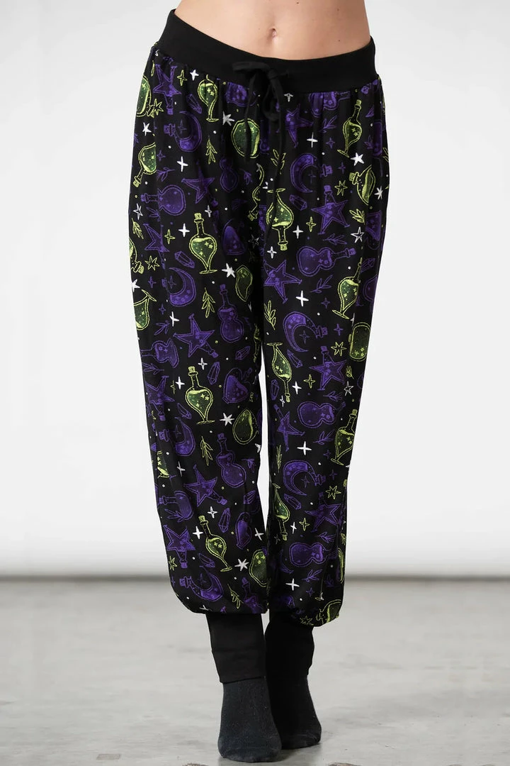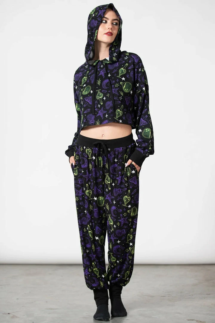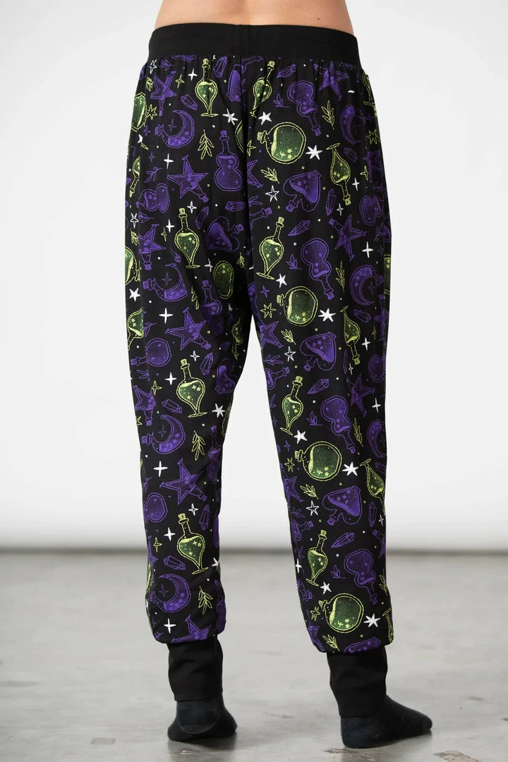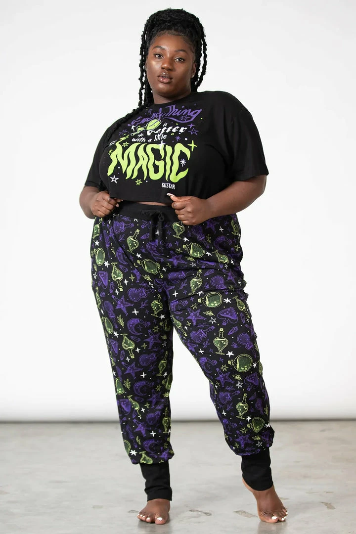 Stylish and comfy black sweatpants from Killstar with bold contrast potion, stars and moon pattern! These must-have jogging bottoms are made from a soft stretchy fabric with elasticated waistband with drawstring and cuffed ankles! The perfect thing for lounging in style, get the Killstar Magic tops for the complete outfit! Made with a relaxed unisex fit that looks great on everyone!
