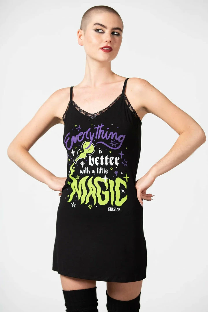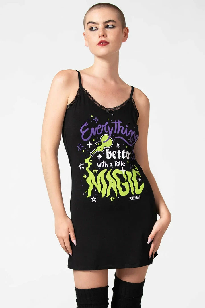 Lovely cami dress from Killstar with the bold and colourful text ‘Everything is better with a little magic’. With lace trim and adjustable spaghetti straps.