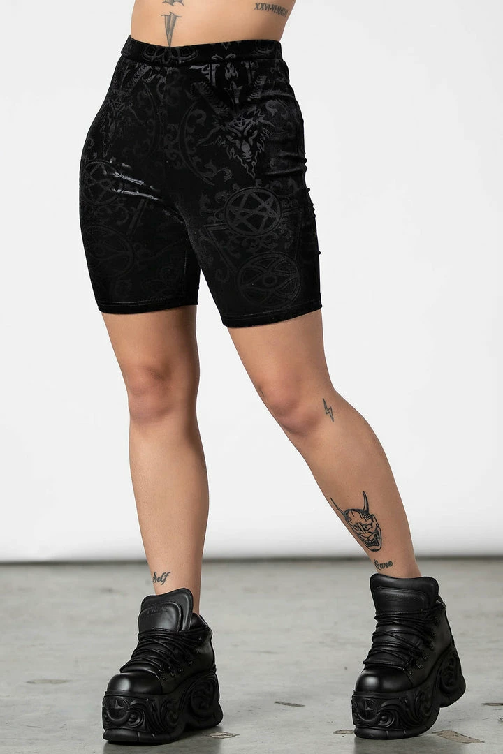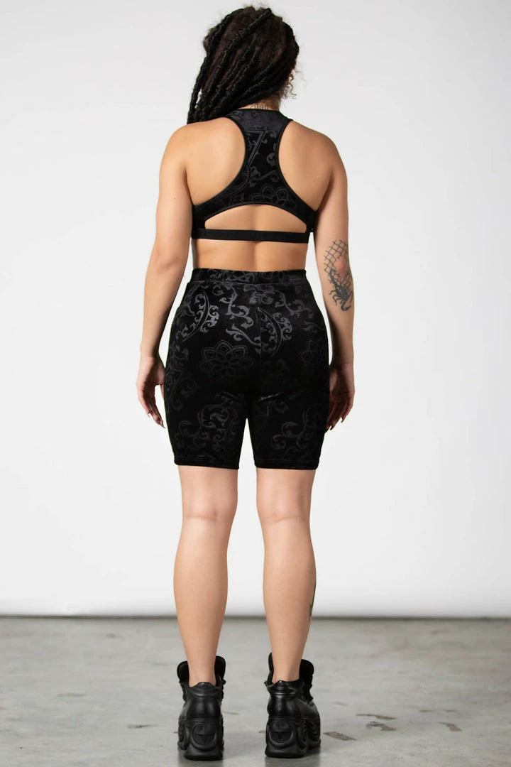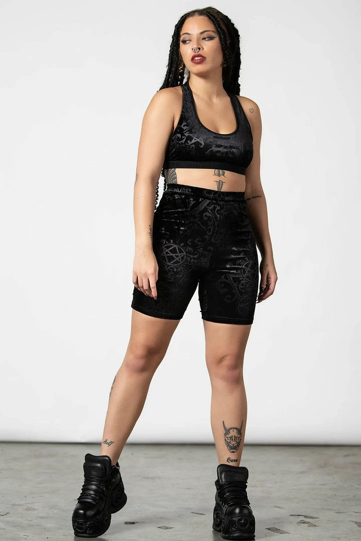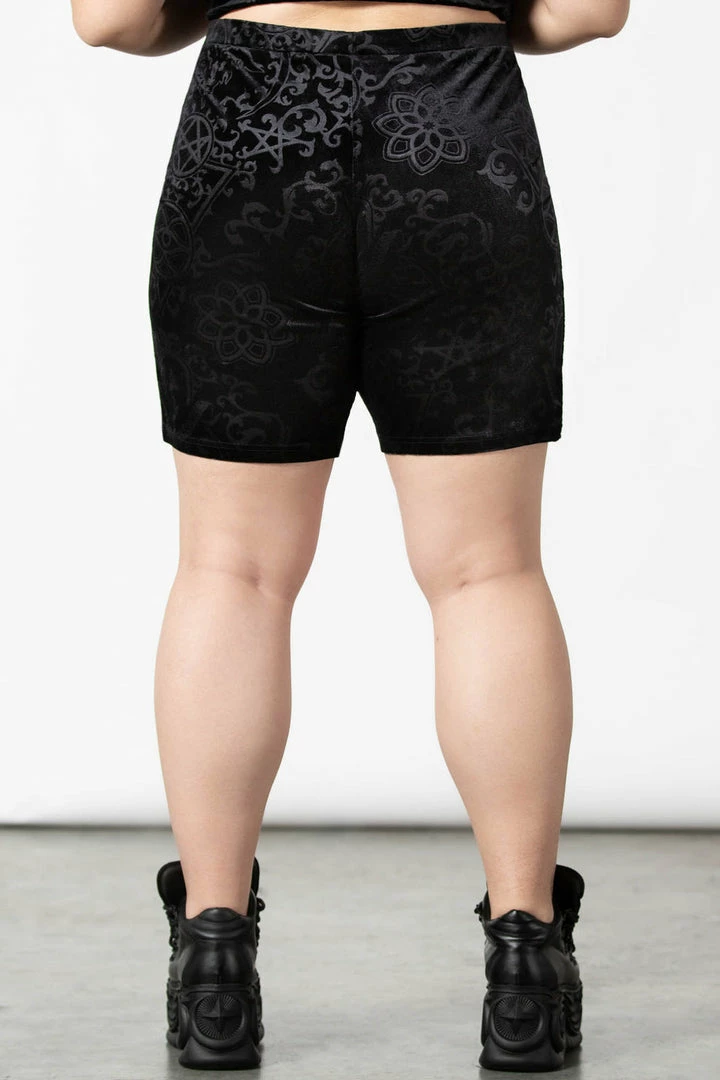 Must-have black cycle shorts by Killstar that are made from a luxurious stretchy burnout velvet fabric that will show off those curves. These gorgeous shorts feature a wide high waistband and will match the Mortalia bralet perfectly. Looks stunning as leisure wear or dressed up as you please!