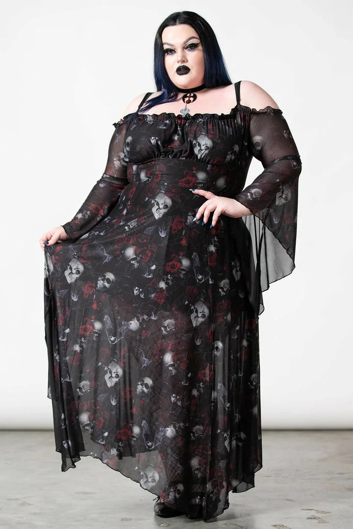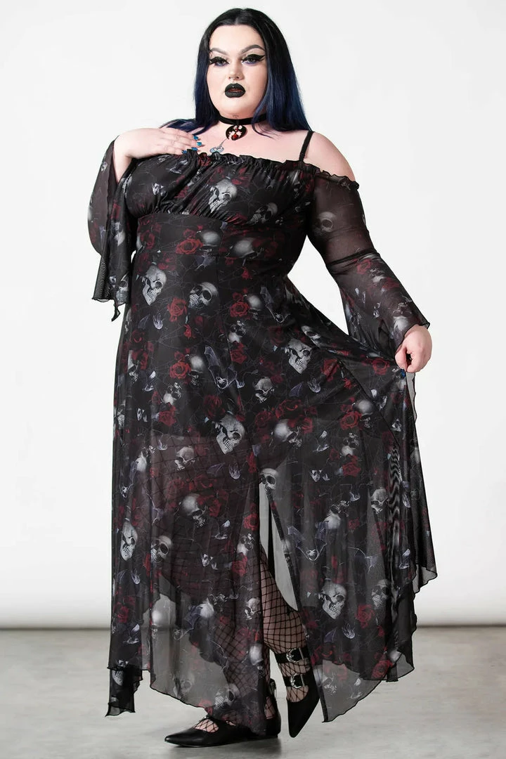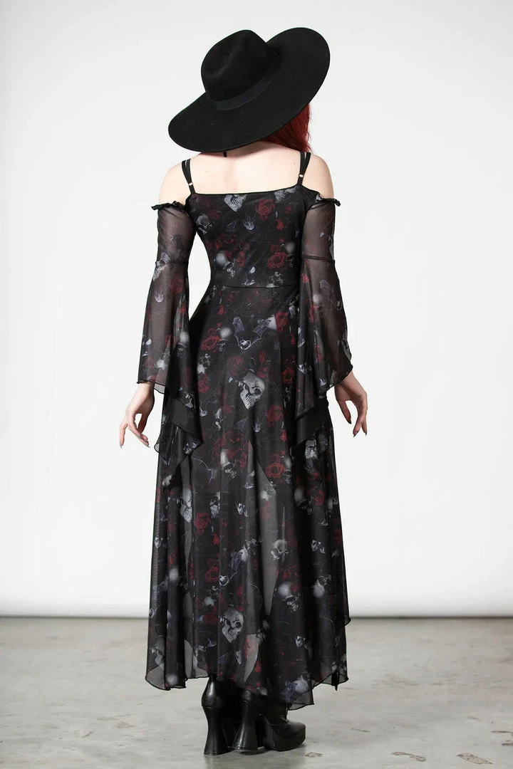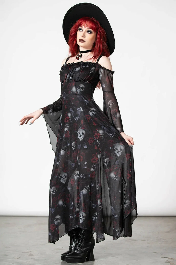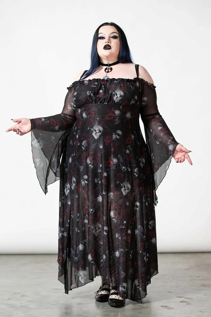 Lovely seductive black mesh maxi dress from Killstar with statement skull and rose print! This gorgeous fitted black dress is made from a luxury soft mesh fabric with long bell sleeves, hanky hem and an opaque black modesty lining! This beautiful flowing dress also features an elegant A line silhouette with off shoulder sleeves with adjustable shoulder straps! Looks gorgeous from day to night!