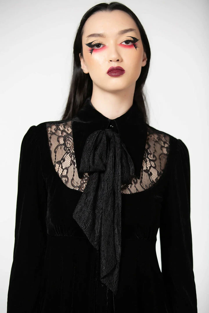 Showstopping black velvet mini dress with collar from Killstar! This stunning LBD is made from a luxury soft stretchy velvet fabric that is fitted to accentuate your figure. This amazing black party dress features a high neck with lace inserts and tie and long bishop sleeves. Beautiful and glamorous, this dress has an A line style with flowing skirt and hanky hem.