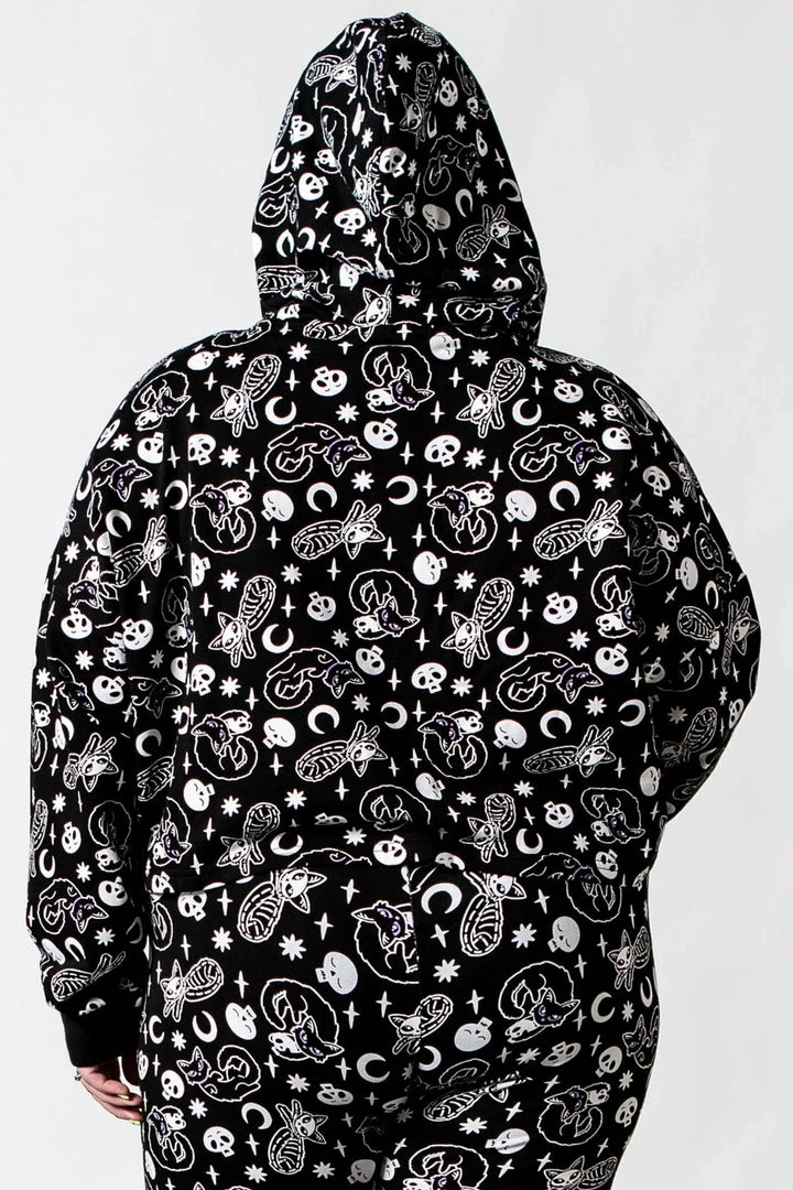 Comfy and stylish black cropped hoodie with awesome white contrast cat and skull print by Killstar. This purrfect hoodie is made from a super soft cotton mix fabric with long sleeves, hood and cropped style. This fun black printed hoodie features a white cat and skeleton print and matches perfectly with other items from the Purr Off collection!