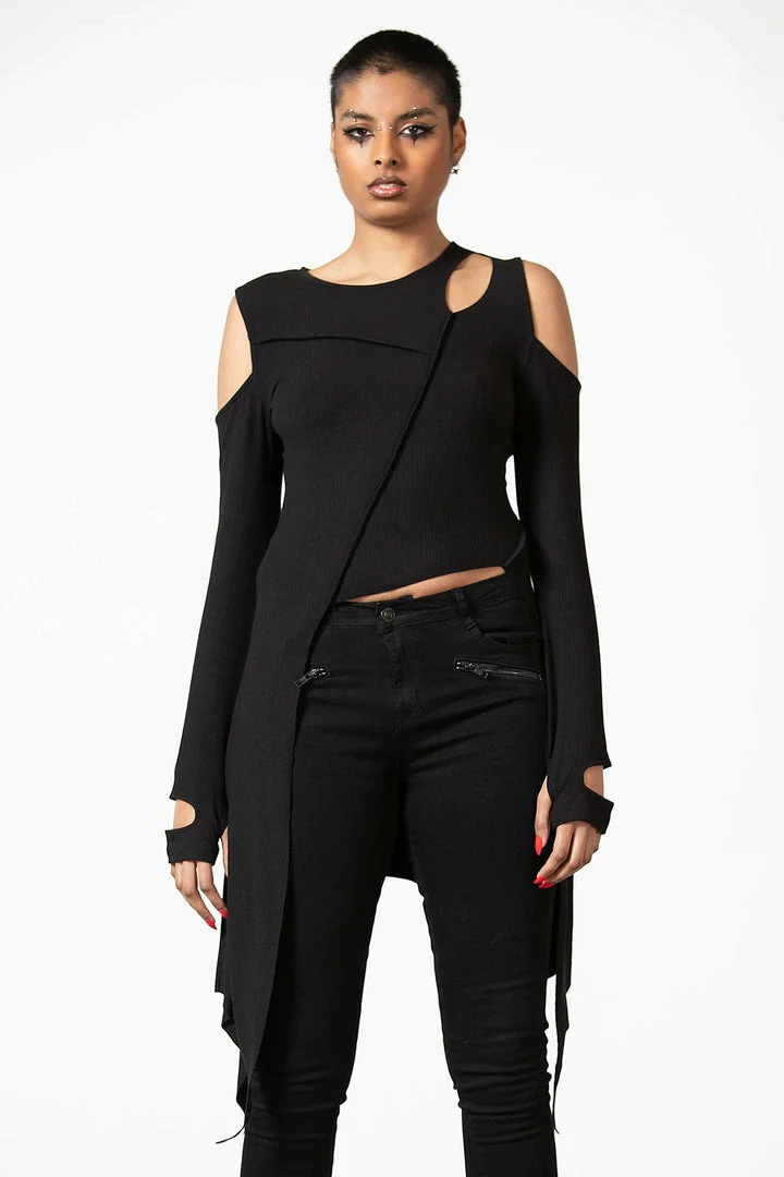 Elegant and comfy black tunic top by Killstar made from a stretchy ribbed fabric that will flatter your figure. This versatile tunic features long sleeves with thumboles, cut out detailing and a stylish flowing hanky hem. Looks amazing dressed up or down!