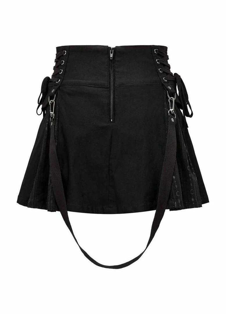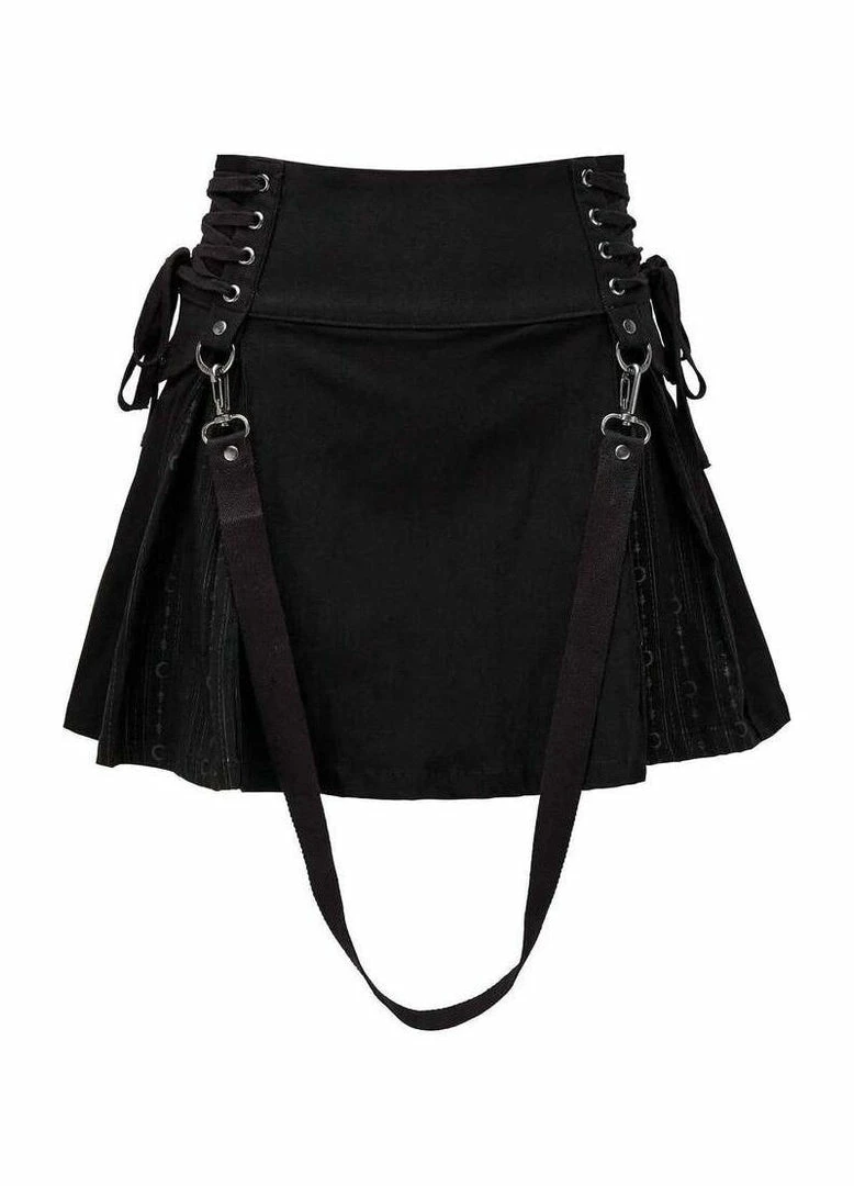 The awesome Sinister Scouts mini skirt from Killstar features classic pleat detailing with a gorgeous contrast crescent moon fabric on the inside. As well as lace-up detailing on the hipe, this cute skirt also includes detachable strap detailing, faux pockets, and a back zip fastening. Measures approximately 16.5″ from waist to hem.