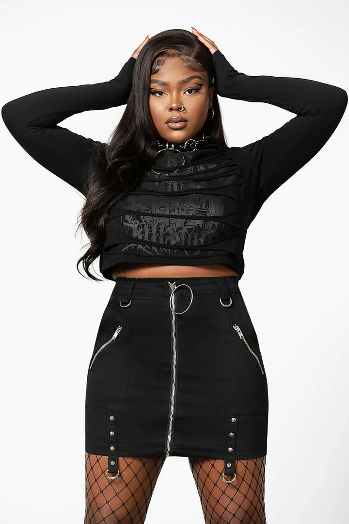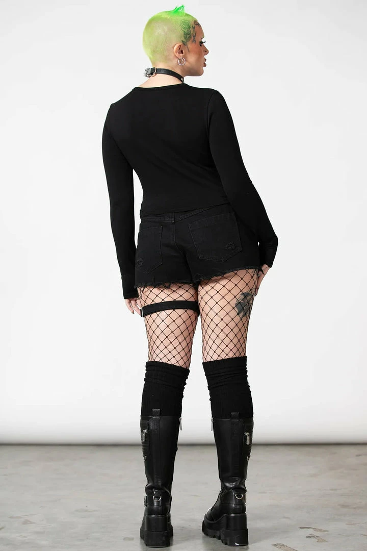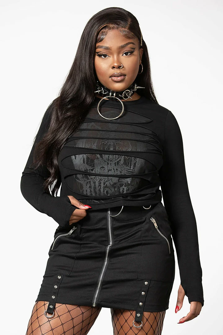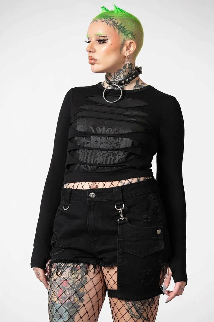 Stylish and versatile gothic black top from Killstar made from soft stretch printed mesh fabric with a slashed cotton overlayer in a slightly cropped style. This stunning long sleeved top hugs your curves and features thumbholes. Looks awesome dressed up or down!