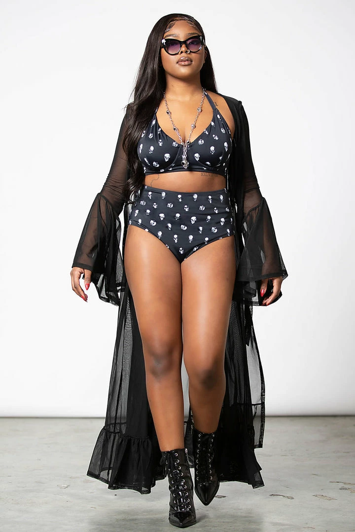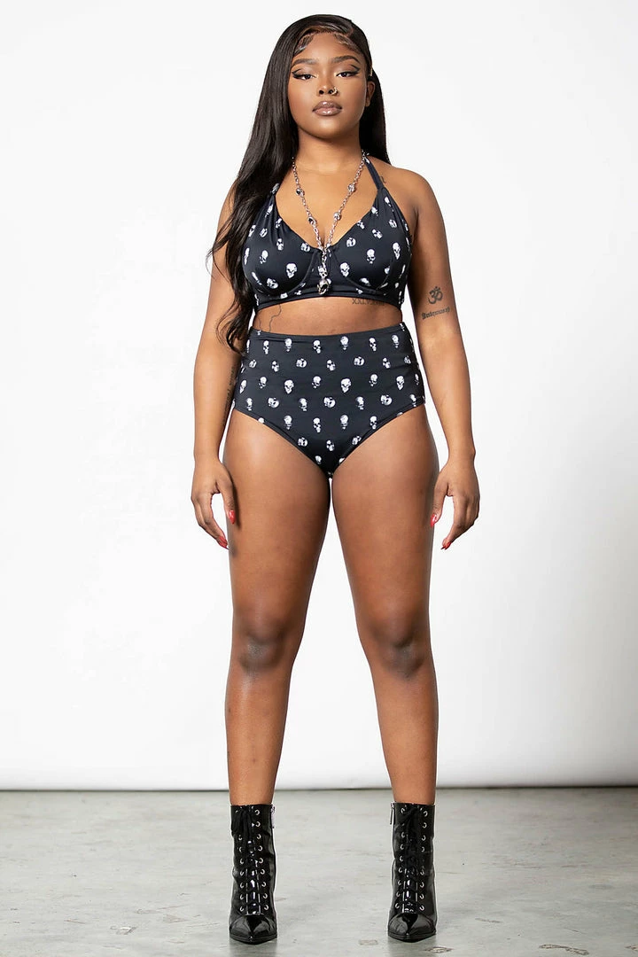 This black and white printed bikini is as hot as hell! This stunning two piece swimsuit features a contrast white skull print, high waisted bottoms and lightly padded cups! This head turning swimwear is made from a soft nylon blend fabric with a halterneck tie and clasp back closure!