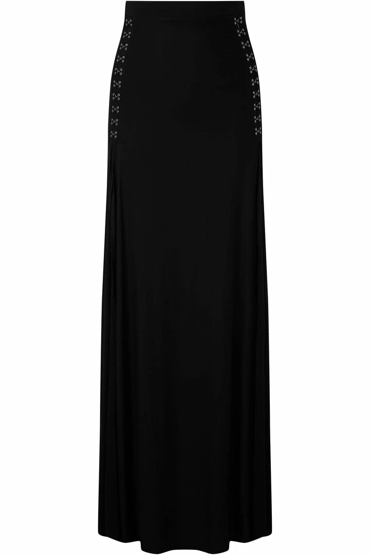 Dramatic extra long maxi skirt from Killstar with an elastic waist. It features high slits with hook and eyes above.