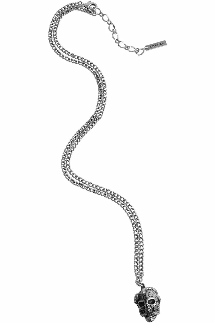 Stunning silver metal skull and snake pendant on a silver metal chain from Killstar that will add an edge to any look! This striking metal skull and snake necklace is exceptional quality with a reinforced design!