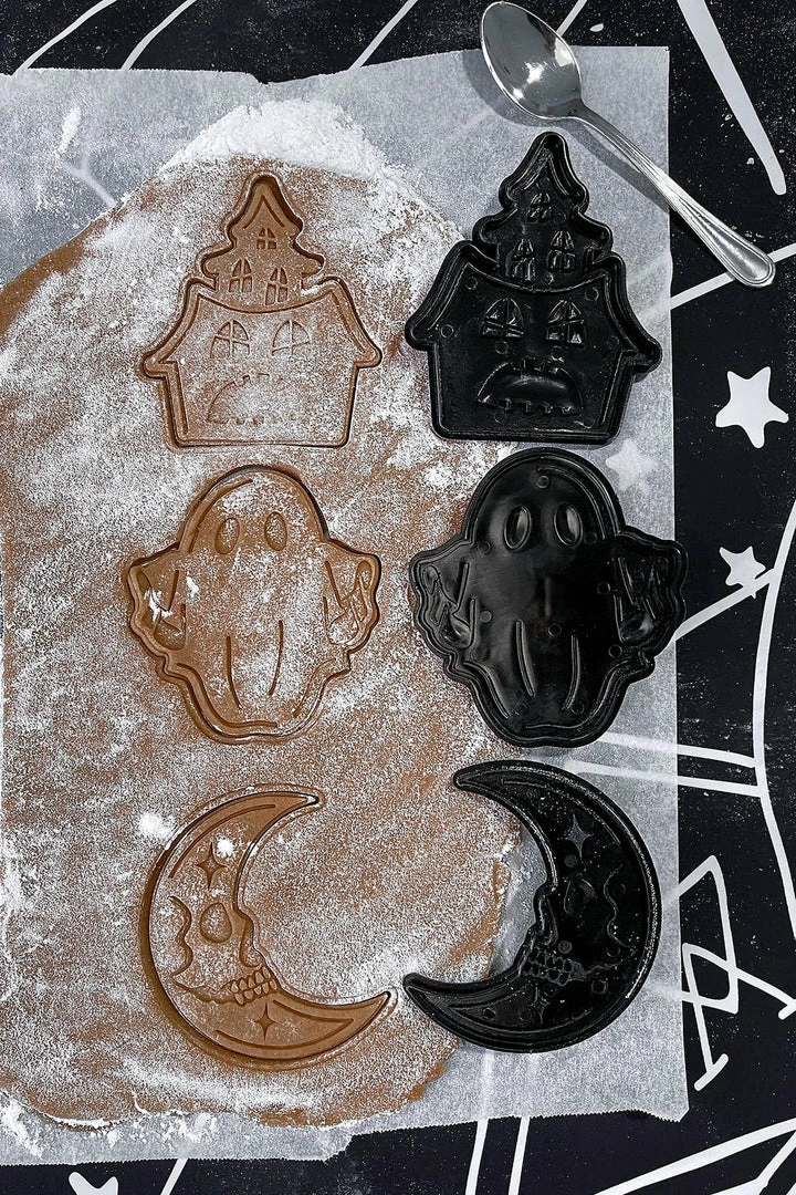 Taste the fear with a set of 3 custom spooky cookie cutters with a ghost, haunted house and skull faced moon shape to choose from. Made from hard plastic, these cookie cutters are the perfect gift for any baking witches.