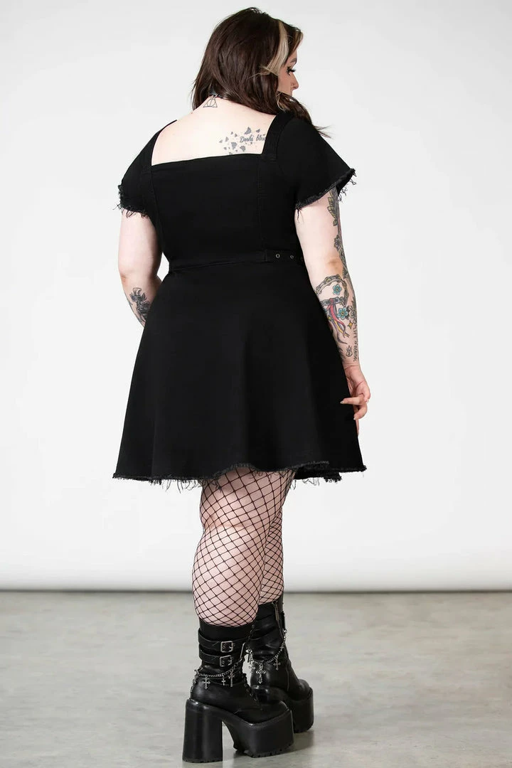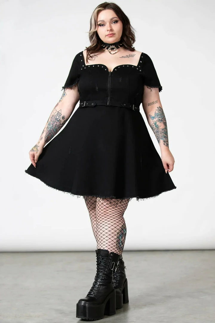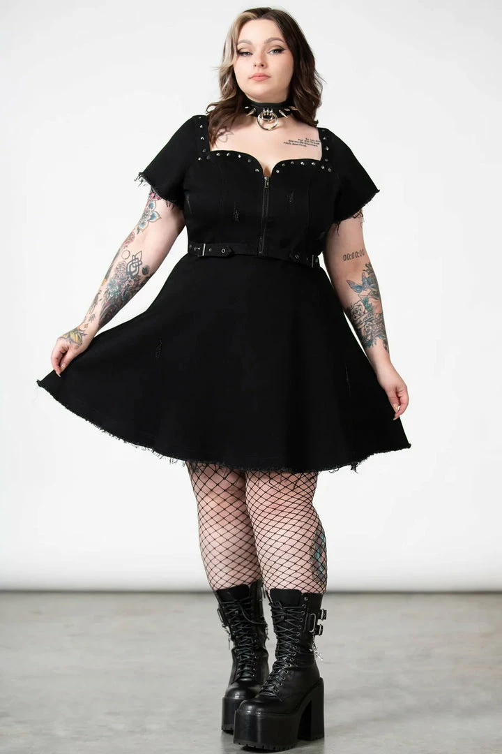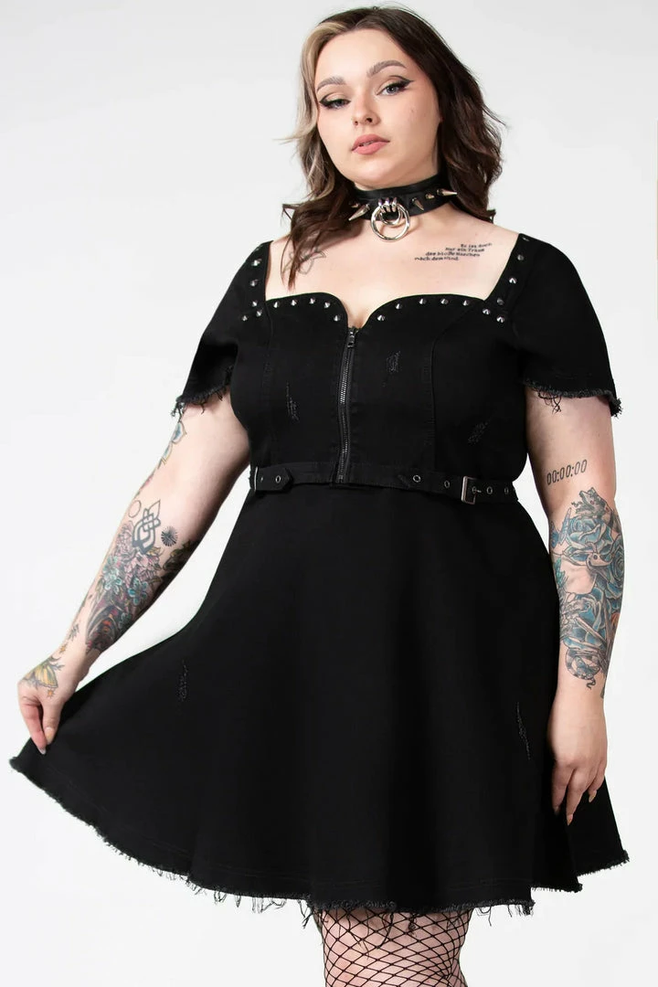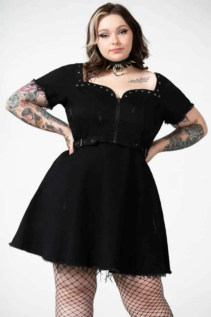 Must-have gothic mini dress from Killstar with distress setailing! This awesome black mini dress is super versatile and features a front zip chest fastening with sweetheart neckline, belt and stud detailing. Made from a soft black slight stretch denim fabric with skater style skirt, it’s perfect for night out!
