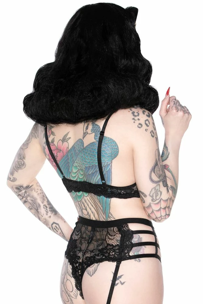 Killstar Tortured Souls Lace Bra in Black is made from a delicate stretch lace fabric for a fit that is both beautiful and alluring. This stunning black bra features a statement choker and accent straps as well as a metal crescent charm detail! The bra is adjustable for the perfect fit and is underwired. Pair this bra with the matching Killstar Tortured Soul Lace Panty for the ultimate gothic goddess look!