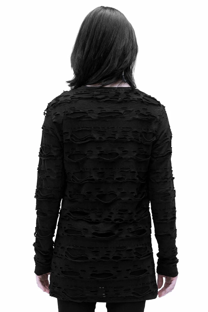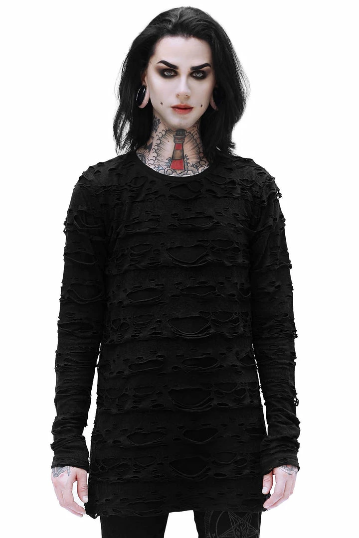 Killstar Undertaker Men’s Black Sleeve Top is made from a soft distressed fabric with a round neckline and fitted sleeves.
