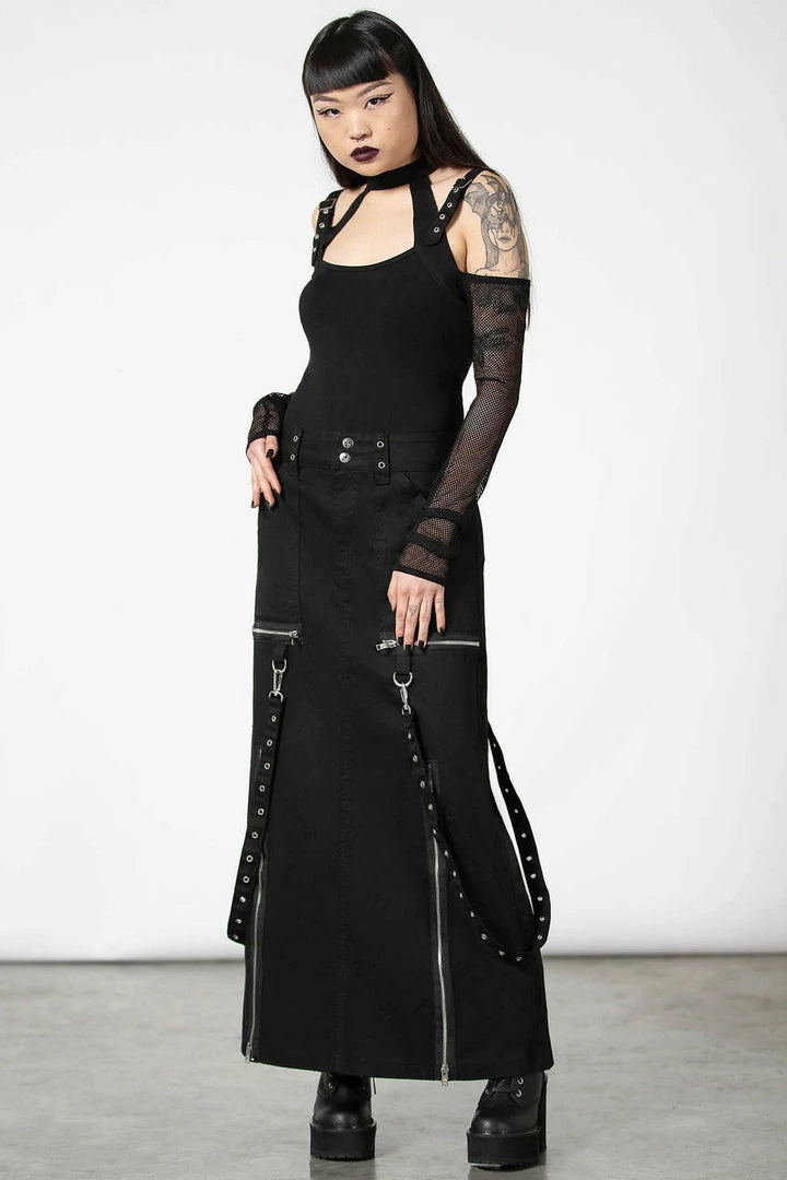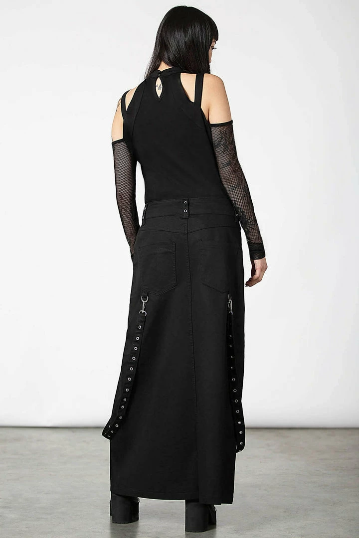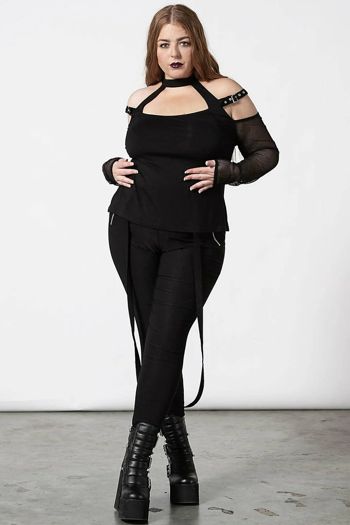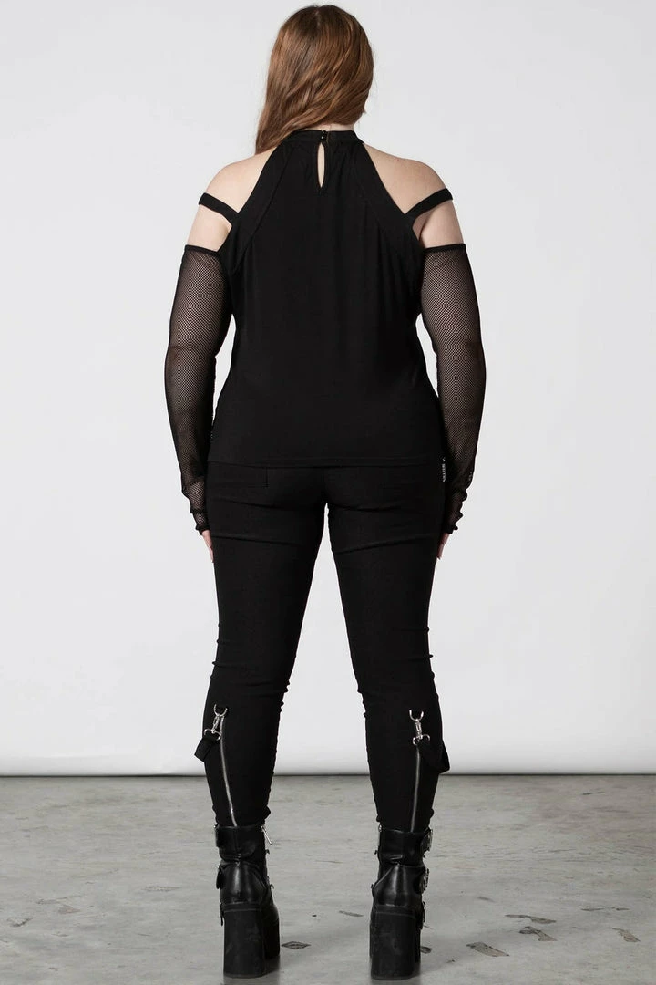 Stunning long sleeve black top with fishnet sleeves. This striking top by Killstar is made from a soft stretch fabric that is fitted to hug your figure. It also features a lovely cut out neckline, statement straps and cold shoulders.