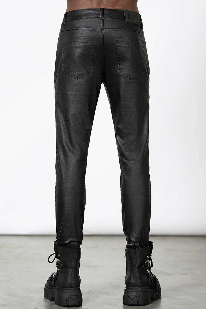 These stylish and versatile black jeans are made from soft stretch wet look fabric with a fitted style that looks great on everyone. These jeans feature classic 5 pocket styling and zip fly and also have metal rivet and zip details.