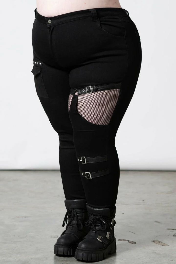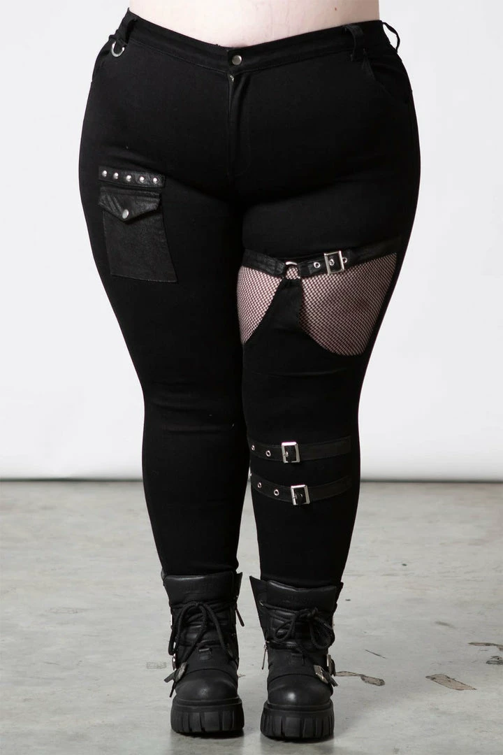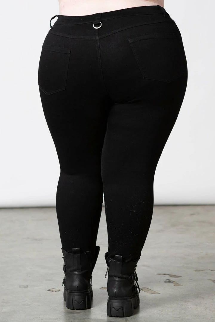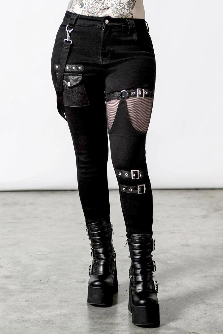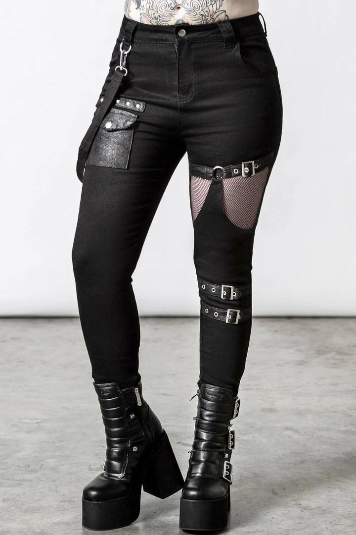 Stunning black skinny jeans from Killstar with buckle details and detachable strap! These must-have jeans are made from a soft stretchy denim fabric for a comfortable figure hugging look! These amazing black trousers feature a fishnet panel and statement pocket and the strap is detachable if you want to change up your look!