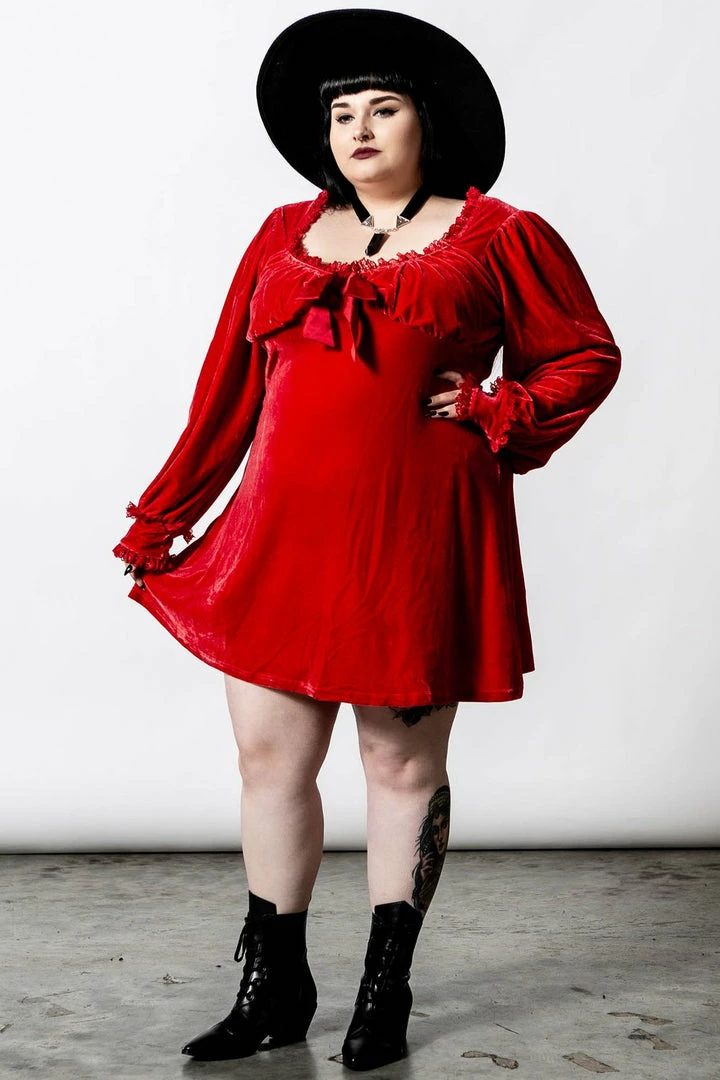 Lovely elegant scarlet red mini dress from Killstar! This gorgeous fitted short dress is made from a luxury soft stretchy velvet fabric with long puff sleeves and a slightly flared skirt! This beautiful dress also features a low neckline with bow detail and delicate lace trim! Looks gorgeous from day to night!